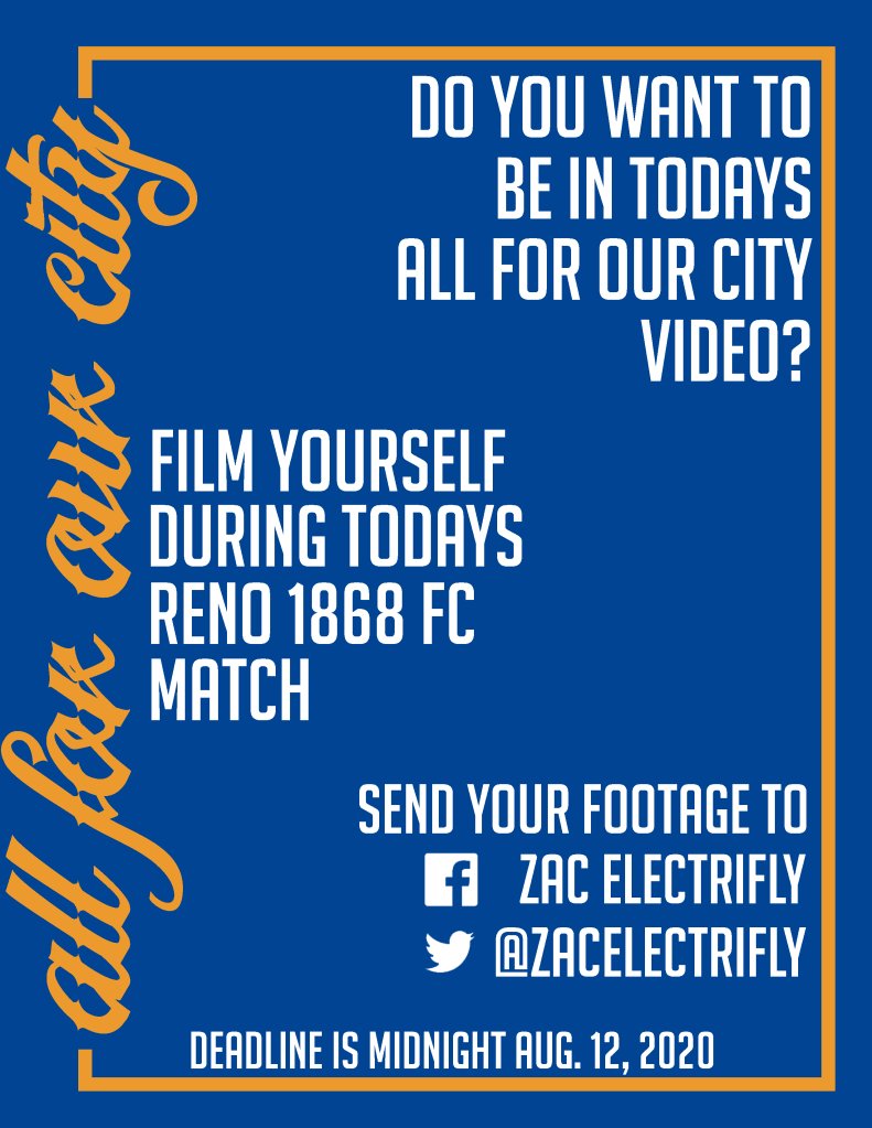 Still no fans at Reno 1868 FC game’s, I am still making All For Our City videos for the 2020 season. I did make a video for the last Reno 1868 FC home match. I will be making one for tonight’s match. This time I will be at the stadium watching from outside, but i am still looking for your help. I would love to feature you in this video. Your reaction to a play, a message you have for the team or fans, almost everything works.