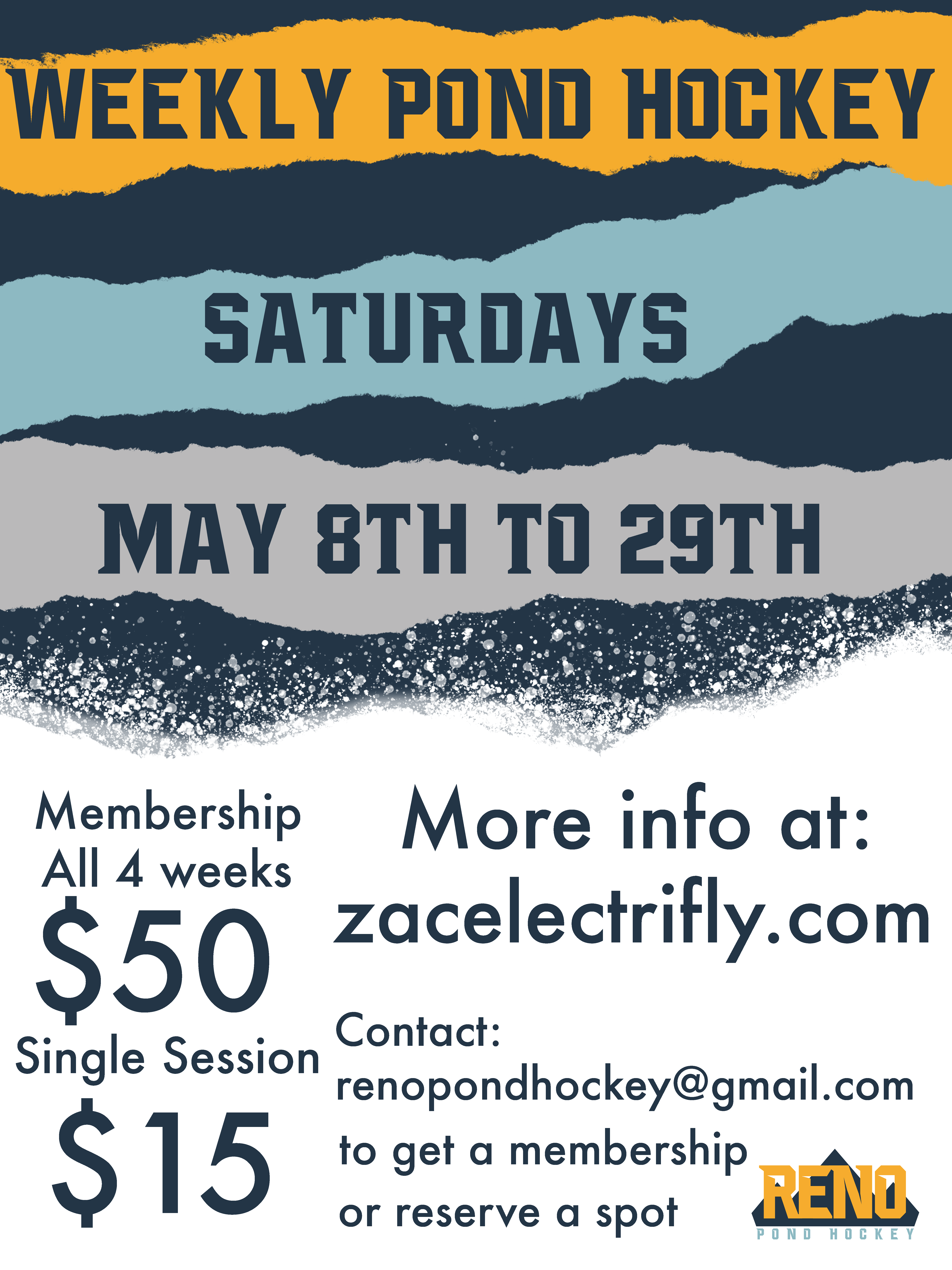 Reno Pond Hockey has rented the ice for 4 weeks starting May 8th. We will be doing one hour weekly pond hockey sessions. We will be playing on Saturdays. We will be able to run up to 3 games at a time if needed. We will be selling memberships at $50 for all 4 weeks. We will need 32 people to buy memberships in order to make this happen. We are not limiting memberships to 32. You do not need to buy a membership to play. You can sign up for an individual day for $15 a session.
