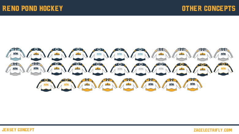 The template for this design is based off of Reno Renegades jersey’s. That template is similar to the Colorado Avalanche jersey’s used from 1995 to 2007. When Adidas took over as the NHL jersey supplier in 2017, they brought in a modern variant of the 1995 to 2007 Colorado Avalanche jersey’s that they continue to use. This template is similar to those designs. The edges in the template can be seen as representing the mountains of Reno. The line seen around the jersey can be seen as representing the Truckee river. I made multiple variations with different colors and logos.