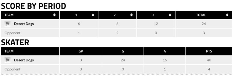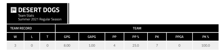 The Desert Dogs have scored 24 goals in 3 games. They have 16 assists giving them 40 total points. Thats 7 points less than Reno Pond Hockey. They have a goals per game average of 8. They have scored on 1 of 4 power plays*. Their power play percentage is 25%*.