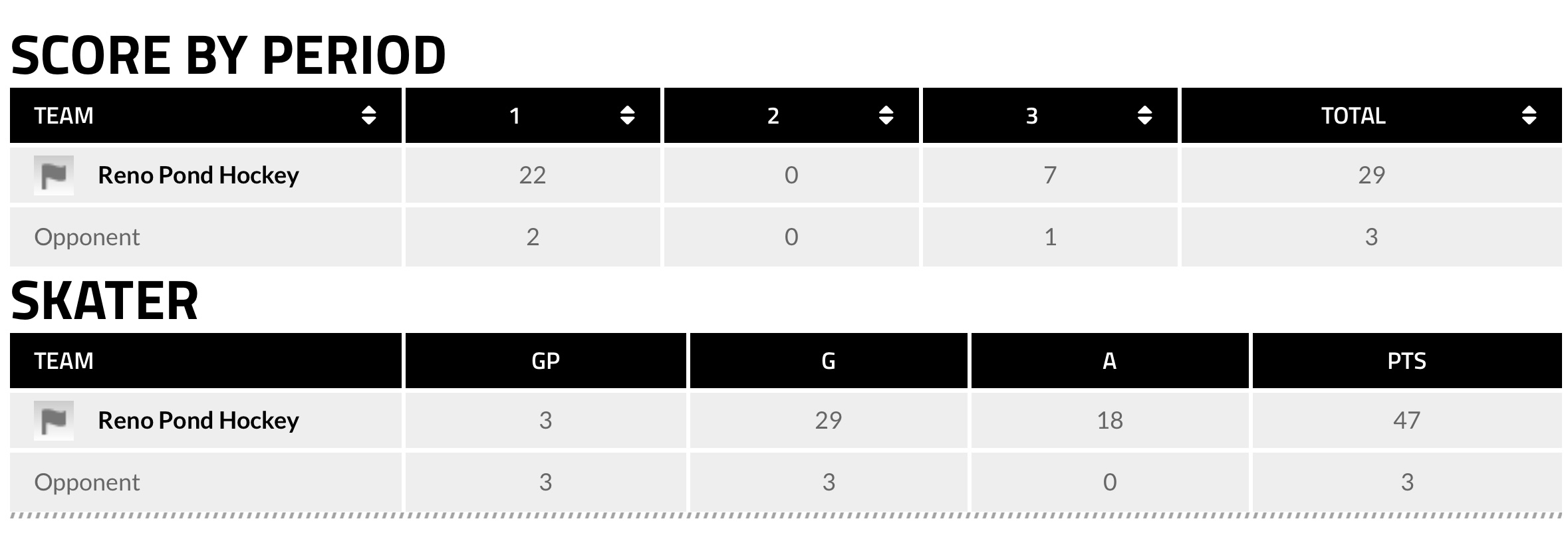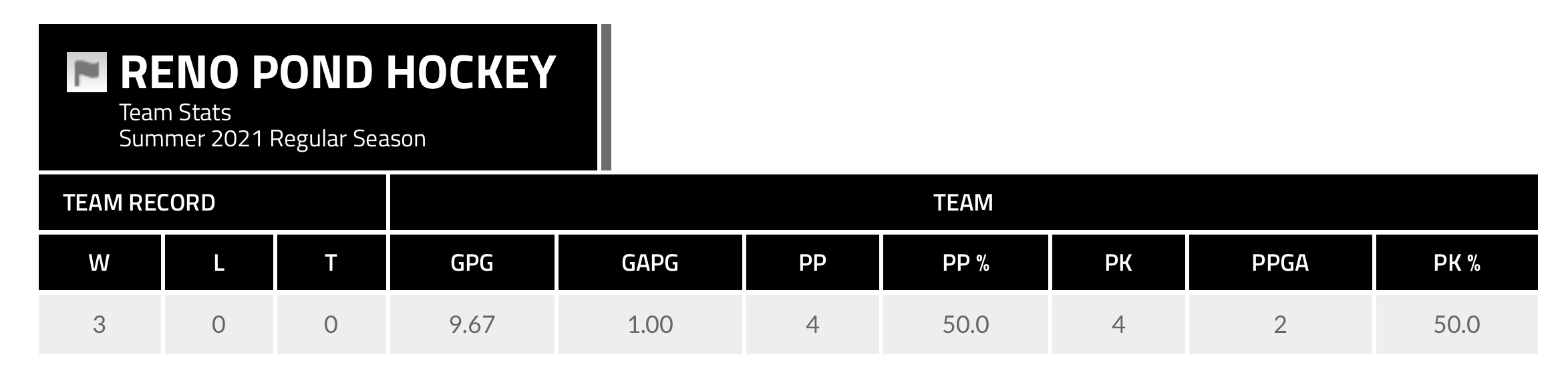 Reno Pond Hockey has scored 29 goals in 3 games. Reno Pond Hockey also has 18 assists for a total of 47 points. Reno Pond Hockey has a goals per game average of 9.67. They have scored on 2 of 4 power plays*. Their power play percentage is 50%*.