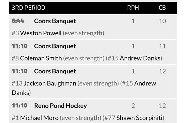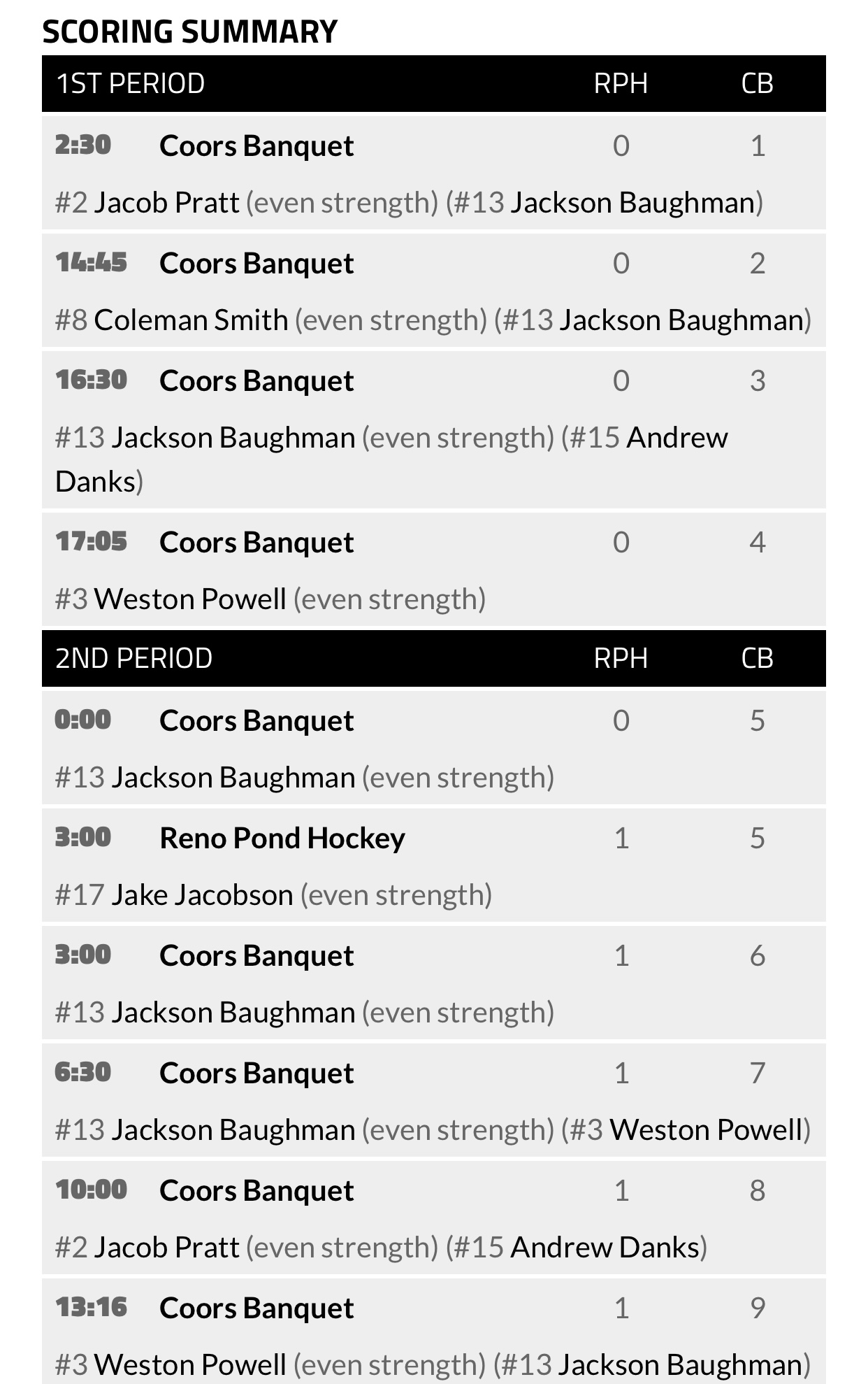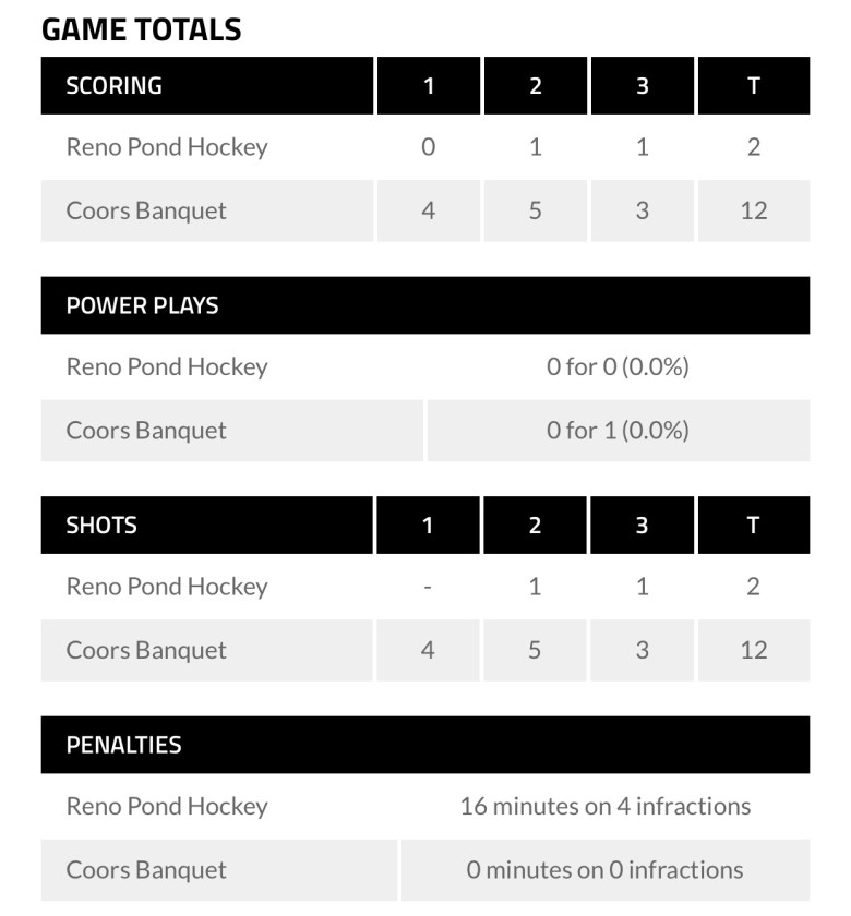 Reno Pond Hockey faced off with Coors Banquet last night. The whole night just didn’t go Reno Pond Hockey’s way. Coors Banquet was just faster and had better talent. There is going to be night like that. They suck but it is going to happen. One of the Coors Banquet players scored 5 goals and got 3 assists. It wasn’t just one player though. I think they could be competitive in A league. Next week Reno Pond Hockey are set to face a team that is just as tough. With 7 games to go Reno Pond Hockey still has a chance to have a winning record and be in the playoffs.