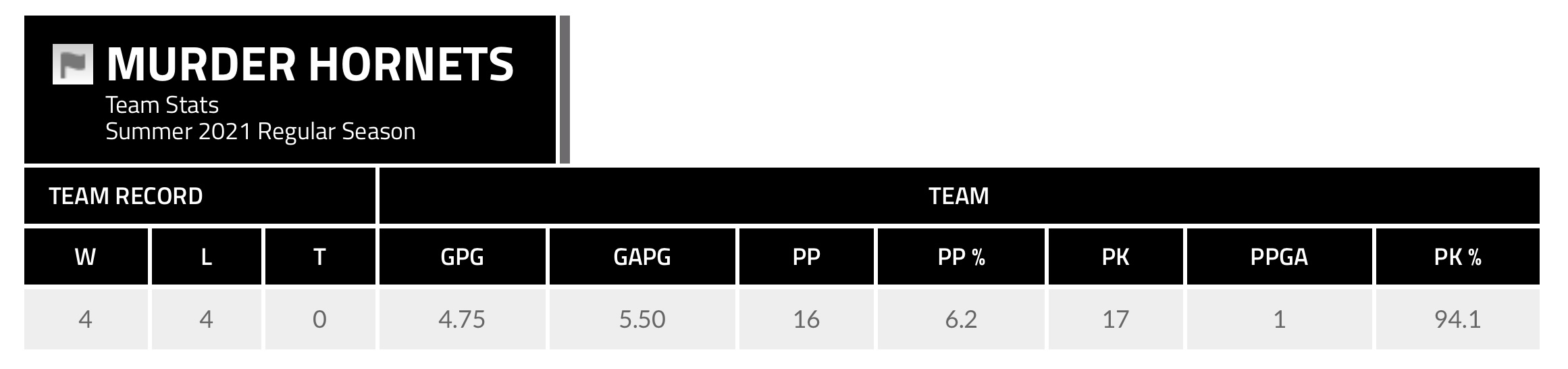 The Murder Hornets have allowed 44 goals this season. They have given up a total of 70 points. Their goals against per game is 5.50. Their goals against average is 5.50. They have been on the penalty kill 17 times*. They have not allowed 1 goal on the penalty kill. Their penalty kill percentage is 94.1%*.