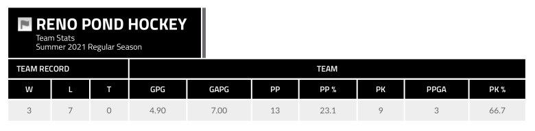 Pond Hockey has allowed 70* goals so far this season. Their goals against per game is 6.78. Reno Pond Hockey has a 7 goals against average. They have been on the penalty kill 9 times. According to the league website Reno Pond Hockey has killed off 6 penalties and allowed 3 goals on penalty kills. On the league website the penalty kill percentage is 66.7%*.