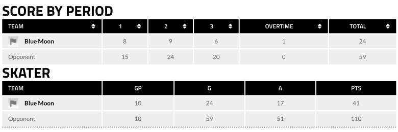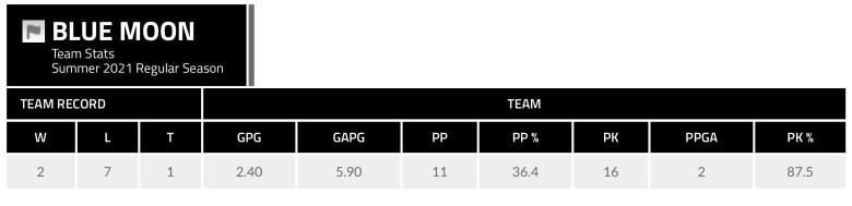 Blue Moon have scored 24 goals in 10 games. They have 17 assists giving them 41 total points. They have a goals per game average of 2.4. They have scored on 4 of 11 power plays*. Their power play percentage is 36.4%*.