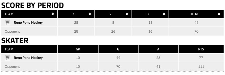 Reno Pond Hockey has scored 49 goals in 10 games. Reno Pond Hockey also has 28 assists for a total of 77 points. Reno Pond Hockey has a goals per game average of 4.9. They have scored on 3 of 13 power plays*. Their power play percentage is 23.1%*.