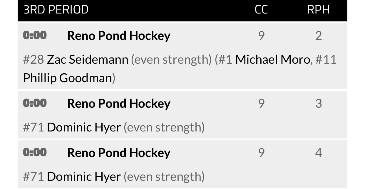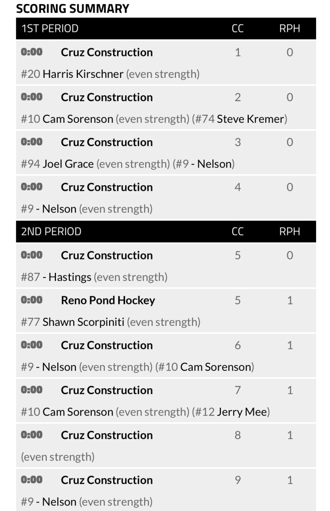 Cruz Construction had a 4-0 lead after the first period. The second period ended in 9-1 Cruz Construction lead. Reno Pond Hockey managed to get 3 goals in the third period but that wasn’t enough.