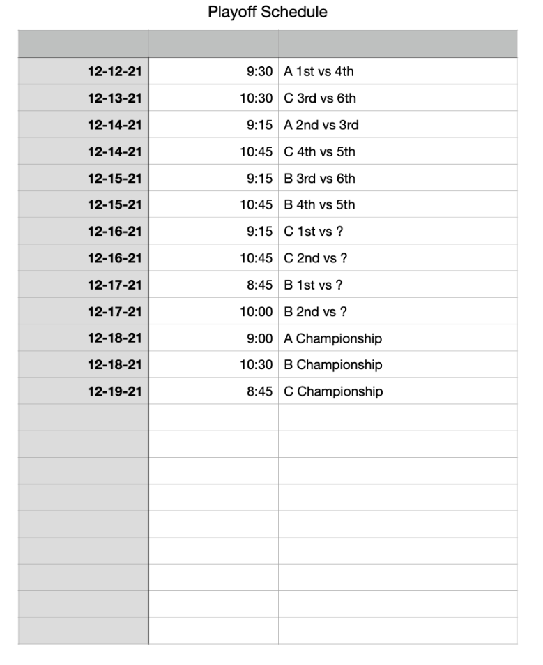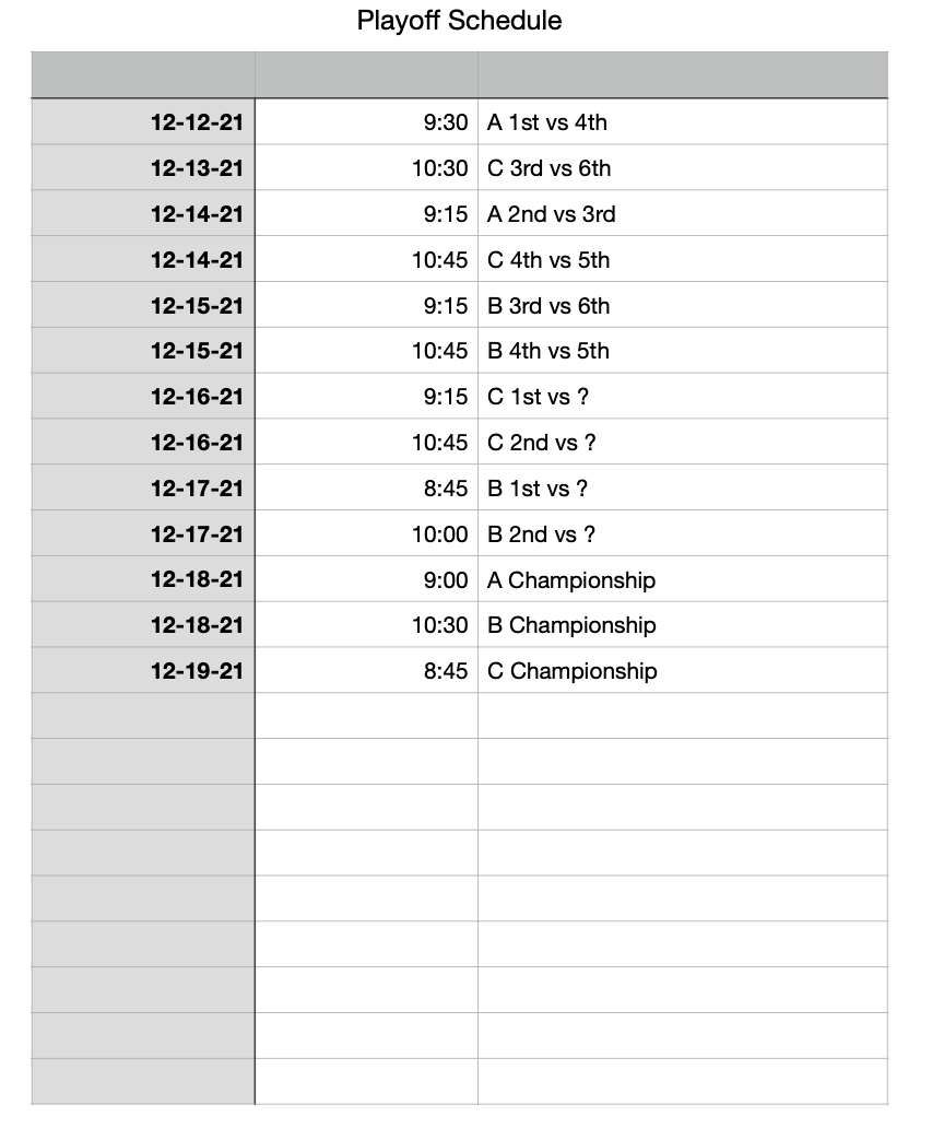 The playoffs will run from December 12th to December 19th. When the playoffs start A-League and C-league will have finished their regular seasons while B-League will still have some games to complete.