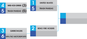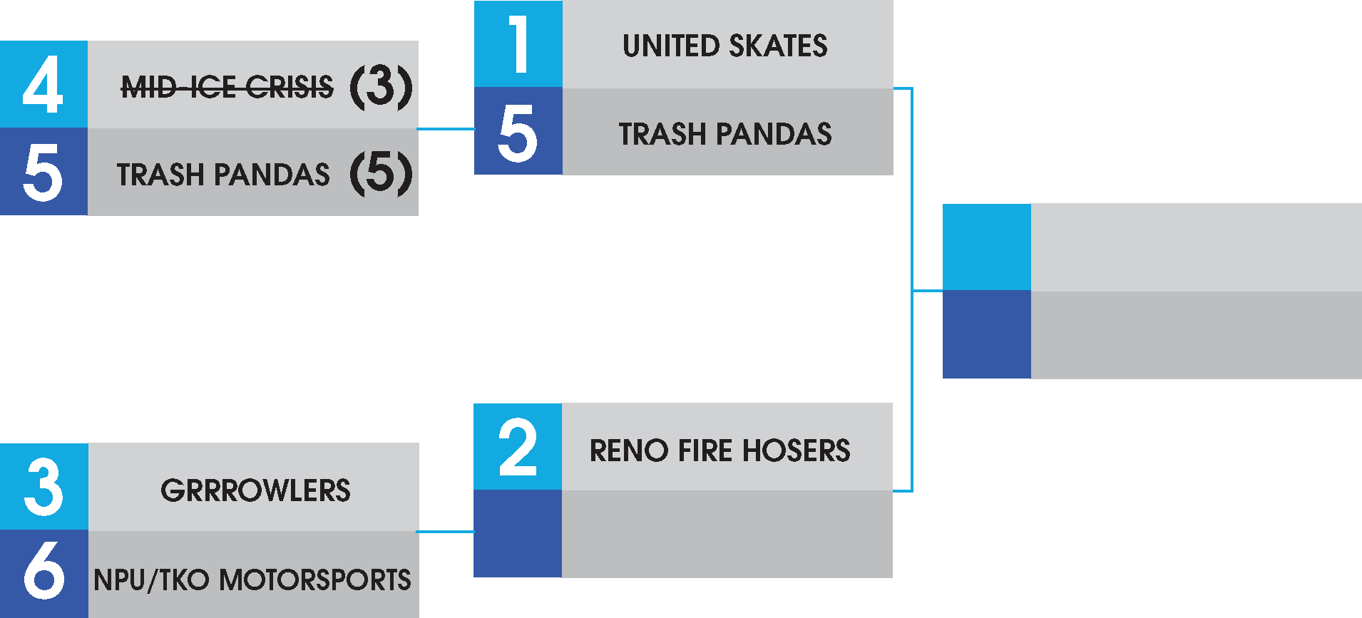 United Skates have won the C-League regular season title after going 9-2-0. (2)Reno Fire Hosers, (3)Grrrowlers, (4)Mid-Ice Crisis, (5)Trash Pandas, and (6)NPU/TKO Motorsports, have secured playoff spots.