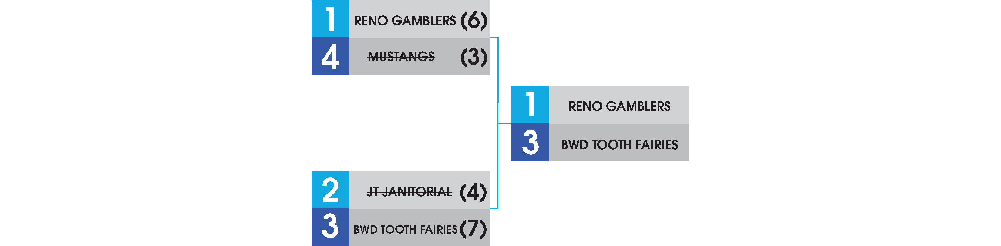 The Reno Gamblers won the regular season title going 11-0. (2) JT Janitorial, (3)BWD Tooth Fairies, (4)Mustangs round-out the A-League Playoffs. The A-League playoffs start tonight. (1)Reno Gamblers will play (4)Mustangs, followed by (2)JT Janitorial vs (3)BWD Tooth Fairies.