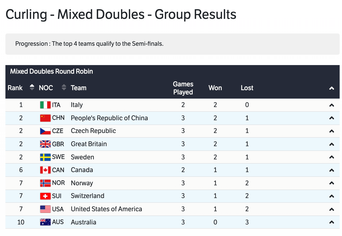 Curling was back in action with more from the Mixed Doubles round robin. China Beat Australia 6-5. Sweden beat the Czech Republic 7-4. The United States lost to Italy 4-8. Great Britain beat Canada 6-4. Huge upset there. Italy beat Switzerland 8-7. The United States lost to Norway 6-11. Norway lost to Canada 6-7. Switzerland lost to Great Britain 8-7. China lost to Sweden 7-6. The Czech Republic beat Australia 8-2.