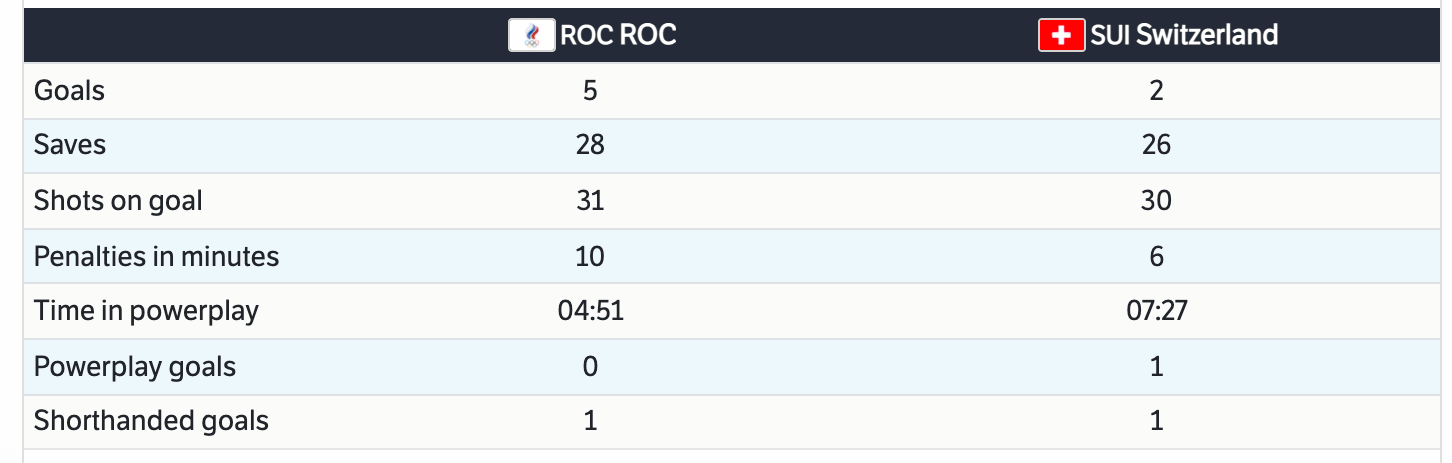 Goaltending let Switzerland down in this one. Despite scoring three more goals ROC (Russia) only one more shot than Switzerland. There were a lot of penalties in this game. Switzerland were able to capitalize on one of their power plays. So that is one of the few positives moving forward. ROC (Russia) was able to score on the penalty kill. A lot of positives in this game for ROC (Russia). After Canadas statement win and the United States response to that, this win by ROC (Russia) put them right behind the United States and Canada as medal contenders.