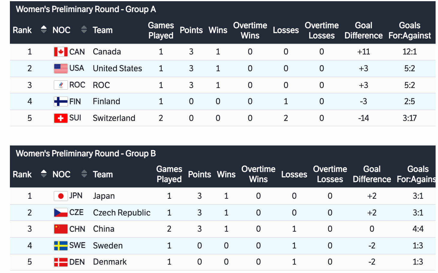 Here are the current group standings. Canada still leads Group A and Japan still leads Group B.