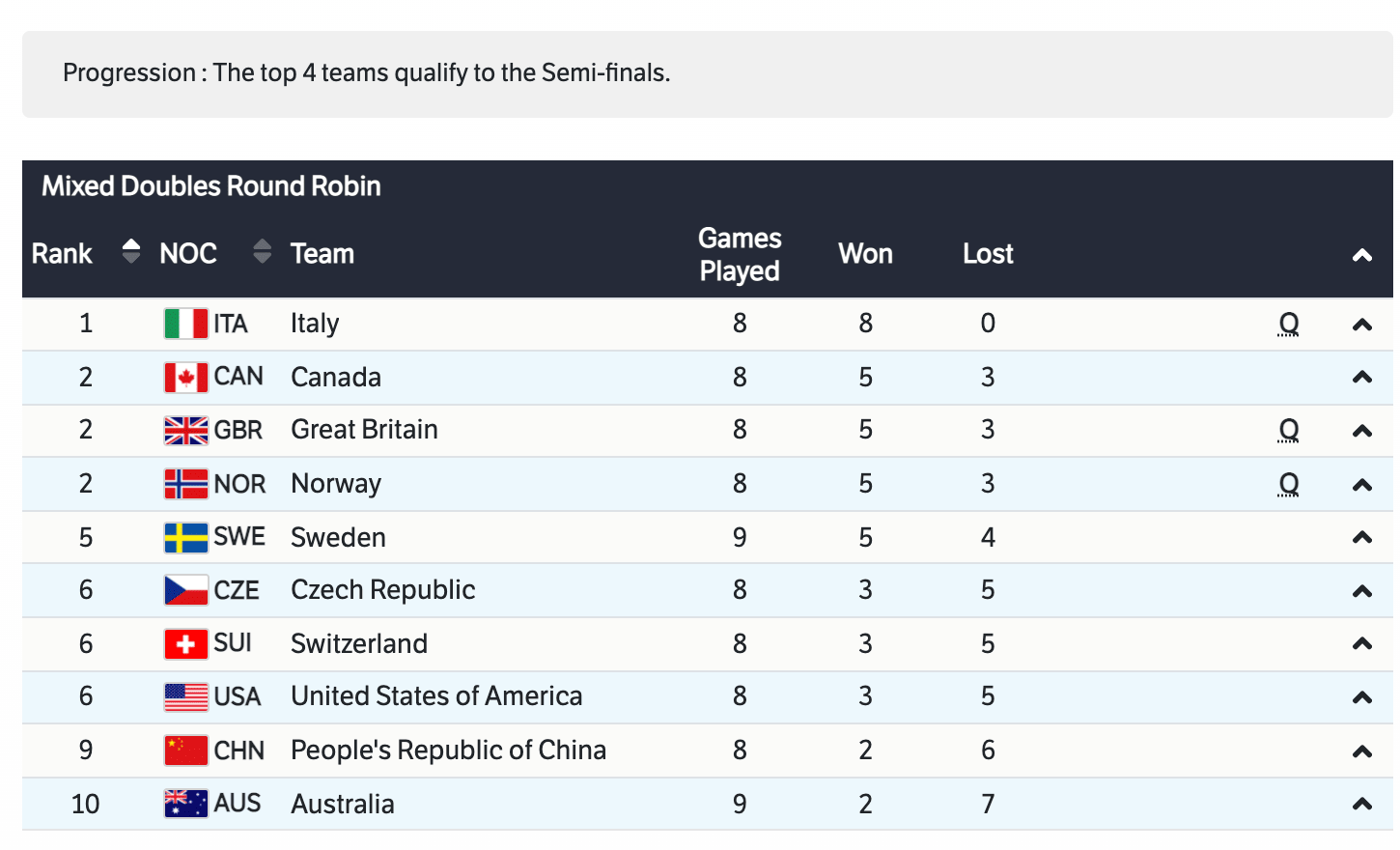 Italy doesn’t look like they will lose a match. Canada and Great Britain look strong. The United States moved to 3-5 after losing both matches. They have to find a way to win. They only have one game left against Great Britain. They need to win that in order to have a chance to move on. Curling will continue tonight with the final games of the Mixed Doubles round robin and the Semi-finals.