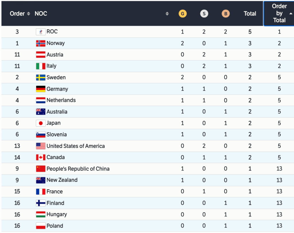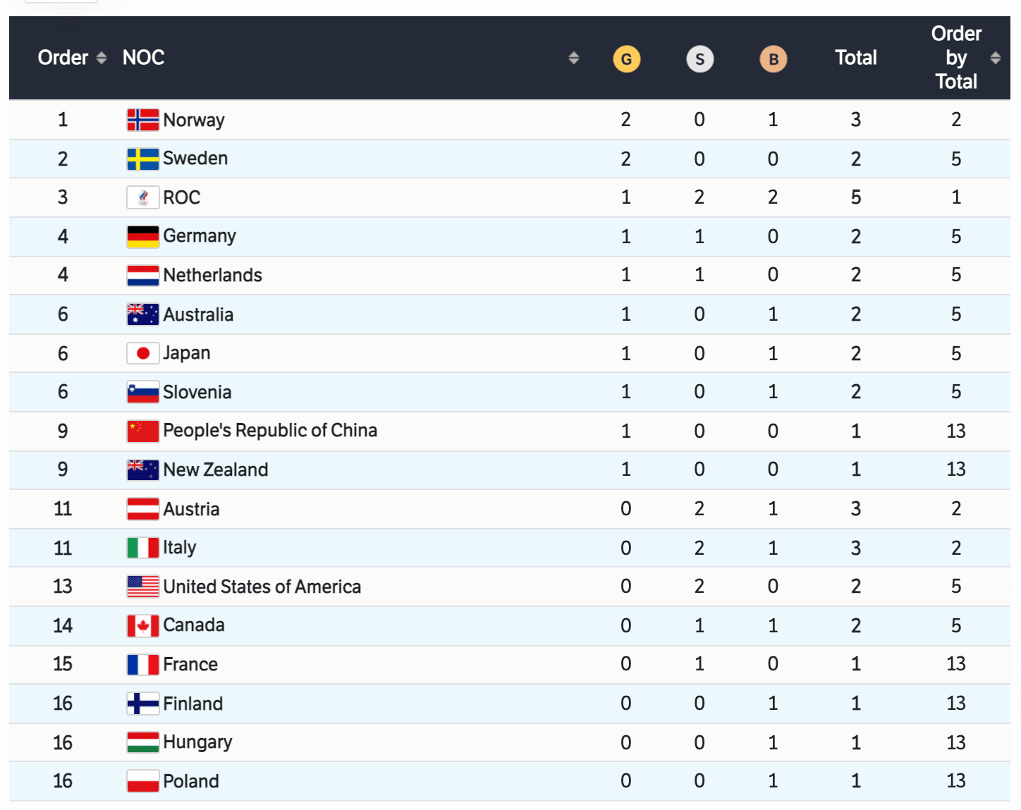 The United States is on the board. We have two silver medals. Norway still leads with 2 gold medals. ROC (Russia) leads the total count with 5 medals.