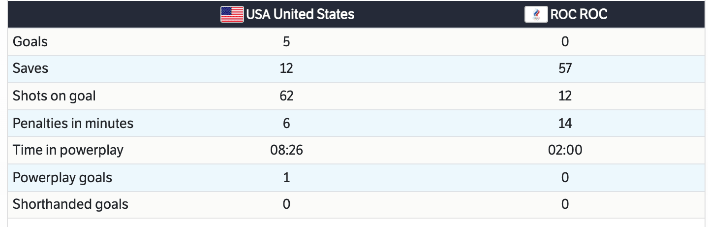 ROC (Russia) took a penalty for hooking a little over 5 minutes into the game. About 5 minutes later they would take a penalty for tripping. The United States would score on the power play to make it 1-0 USA. Savannah Harmon would score the goal. Hilary Knight and Hanna Brandt would get the assists. That would be the only goal of the first period. The United States would take the 1-0 lead into the second. The United States and ROC (Russia) would start the second period by taking coincidental tripping penalties. The United State would score their second goal 28 minutes into the game. Hilary Knight would score. Savannah Harmon and Kendall Coyne Schofield would get the assists. The United States would take a 2-0 lead going into the third period. The United States would score 3 goals in 5 minutes in the third period to take a 5-0 lead. The third goal was scored by Grace Zumwinkle. It was assisted by Dani Cameranesi and Megan Bozek. The fourth goal was scored by Jesse Compher. It was assisted by Abbey Murphy and Hayley Scamurra. The fifth and final goal was scored by Alex Carpenter. It was assisted by amanda Kessel and Savannah Harmon. Following 3 goals in 5 minutes ROC (Russia) would replace their goal keeper. There were four penalties in the last 10 minutes of play. ROC (Russia) got one for Tripping then boarding. The United States got a roughing penalty for their response to the boarding. Then ROC (Russia) got a penalty for an illegal check to the head or neck. The United States tried to argue it should be a 5 minute penalty instead of a 2 minute penalty. There was a little over a minute left in the game so it didn’t matter. However I think it should have been a 5 minute penalty for head contact.