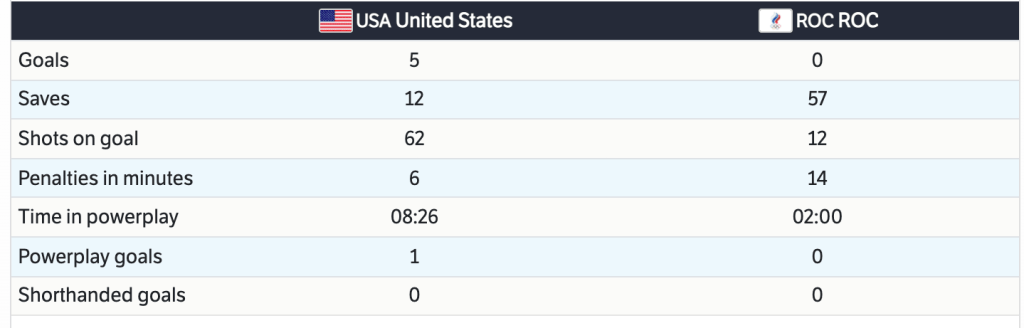 I didn’t know that going into this tournament ROC (Russia) was having COVID issues. Some of their top players missed this game. The United States was dominate in this game. The scoreline shows that. They kept ROC (Russia) stuck in their own zone for majority of the game. ROC (Russia) took a shot after the buzzer in the first period. Some of the USA players took exception to that. If this was not international competition there would have been more than players just jetting in each others faces. At one point ROC (Russia) did fight back and create some scoring chances but the United States scored and ended any momentum ROC (Russia) had. This is back to back olympic shutouts against ROC (Russia) for United States goaltender Nicole Hensley. Things did start to get more physical and heated up as the game came to a close. I wouldn’t be surprised if things got really physical or heated if these two teams face each other again in this tournament. A huge positive is that the United States is seeing goals coming from a lot of different players.
