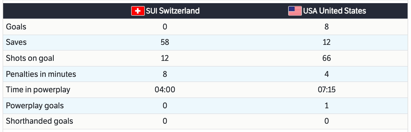 Something I noticed early on is that Switzerlands defenders were letting players get behind them and to the net. Switzerland was not protecting their net. That might be what has been hurting them so far. If they let that continue they wont win a game in the group stage and will be one and done in the elimination stage. The United States did a good job at keeping the puck and puck possession. That is something that we haven’t seen from Canada. Canada has been scoring at will but has not had the some level of control of the puck that the United States have shown. With puck control the United Sates were able to put a lot of pressure on Switzerland. That may be something to watch out for moving forward. The United States hasn’t had a lot of line rush so far in this tournament. They haven’t been rushing the puck up the ice. They have been going up the ice as a team. This win marks back to back shutouts for the United States in the olympics. It is going to make the USA vs Canada game very interesting. Canada being a scoring team and the United States being more of a defensive team. These two shutouts are definitely a message to Canada. That message being it doesn’t matter how meany goals you score against other teams you wont put up those number against us.