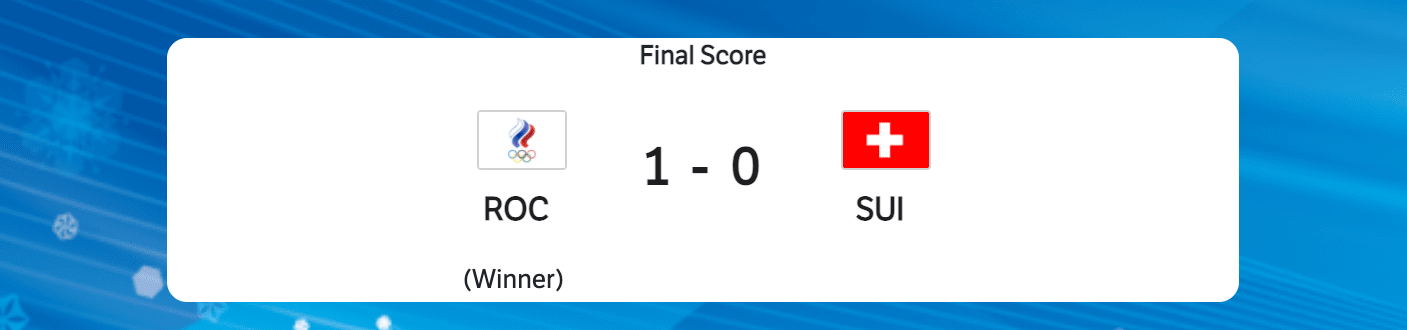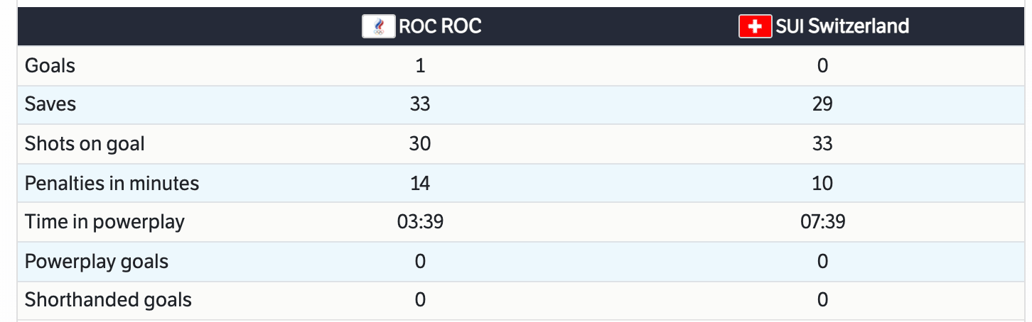 To start the tournament ROC (Russia) played Switzerland. ROC (Russia) scored the only goal of the game in the last minute of the first period. ROC (Russia) would win the game 1-0. It was a heated game. There were a lot of roughing penalties. There were four coincidental roughing penalties in the second period. It was hard fought and close.