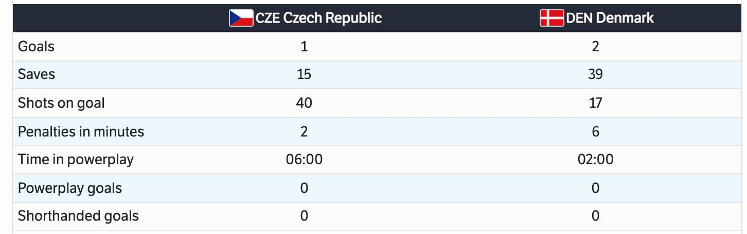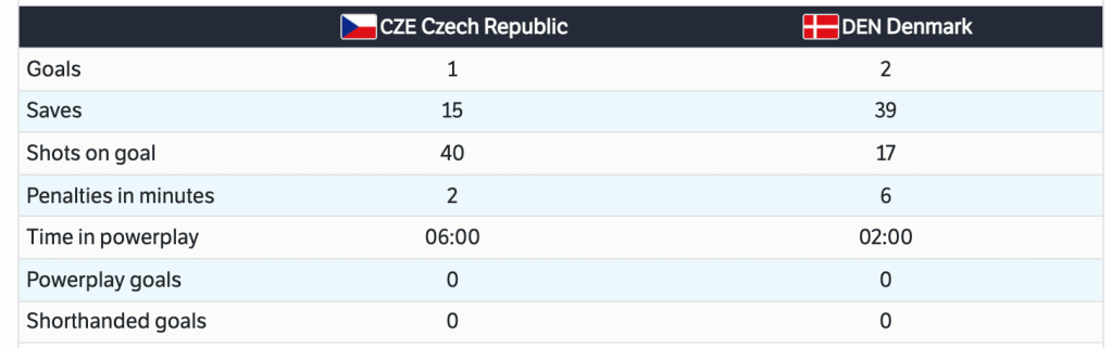 Czech Republic outshot Denmark 40 to 17. With 40 shots they should have more goals. They are taking a lot of shots but not getting quality scoring chances. Denmarks goalie won this one for them. He made 39 saves. This wasn’t as aggressive as the last games. I think all the games with ROC (Russia) will be aggressive. The difference in this game came down to the penalty shot.