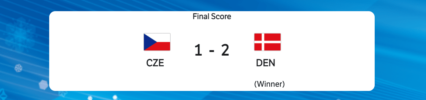 Czech Republic vs Denmark. Denmark opened up the scoring in the first period. Czech Republic gave up a penalty shot late in the first period. Denmark scored on the penalty shot. Denmark took a 2-0 lead into the second period. Czech Republic would cut the lead in half 3 minutes into the second period. The only thing to happen in the third period was a hooking call on Denmark. Denmark would win the game 2-1.