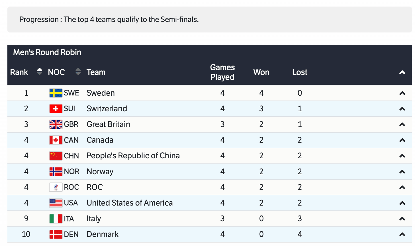 In Curling there was more round robin matches for both the Men’s and Women’s competitions. Eleven matches were played. Sweden Leads the Men’s standings. They are the only team still undefeated in the Men’s competition. There is currently a 5 way tie for the fourth and final spot into the elimination round. In the Women’s competition Switzerland leads. The USA is tied for second. Curling continues tonight with 8 more matches.