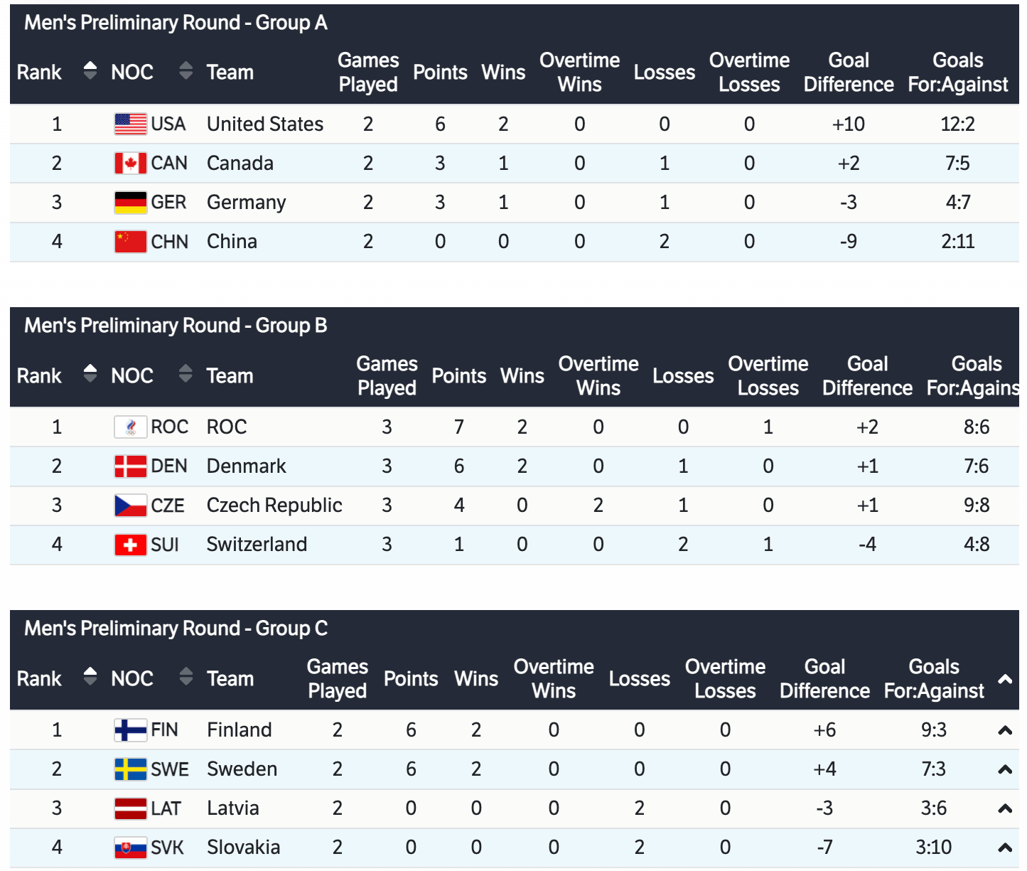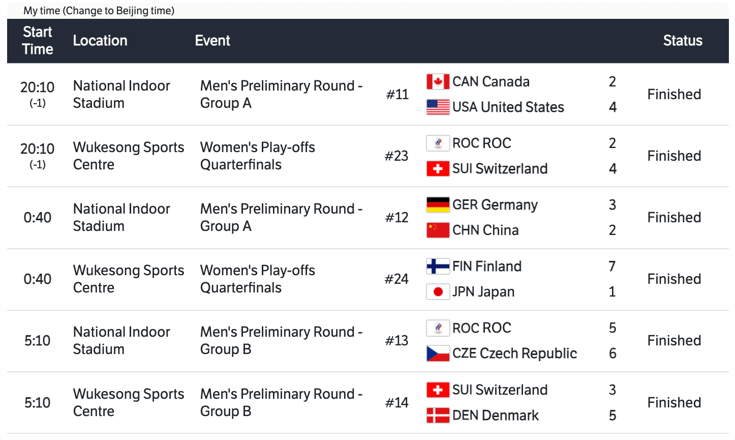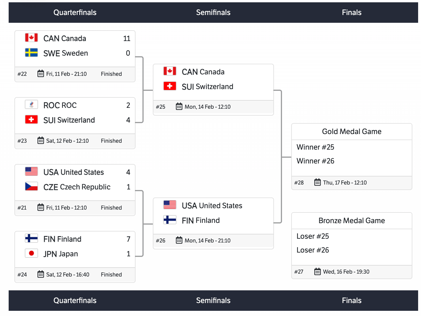 There is a lot to cover in Ice Hockey. If I don’t cover it all today in additional post, I will cover it tomorrow in those posts. There is a lot to cover. The USA played Canada. The Women’s tournament Semi-final matchups are set. Three out of the four teams in the Semi-finals will get medals. There are four games coming up tonight.