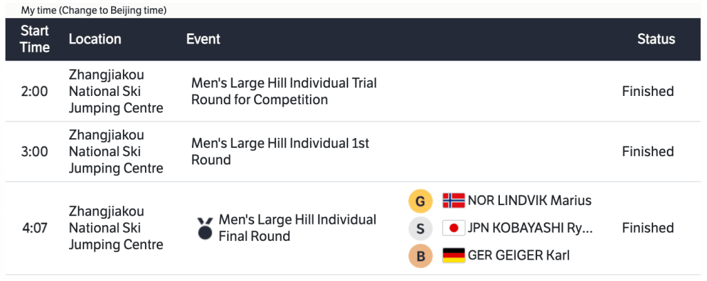 Ski Jumping. They continued the Men’s Large Hill Individual competition. Norways Marius Lindvik won gold. Japans Royoyu Kobayashi won silver. Germanys Karl Geiger won bronze. Ski Jumping will continue in the AM.