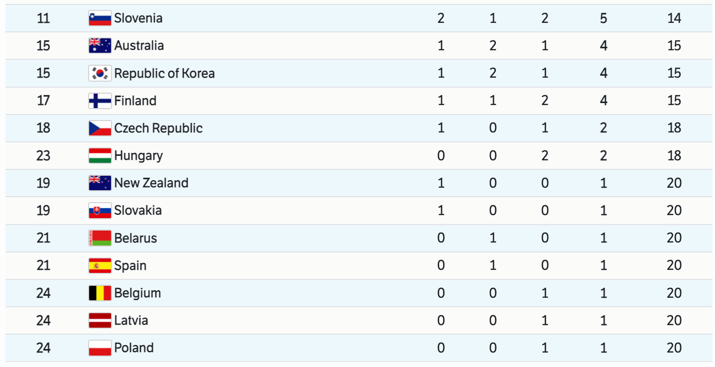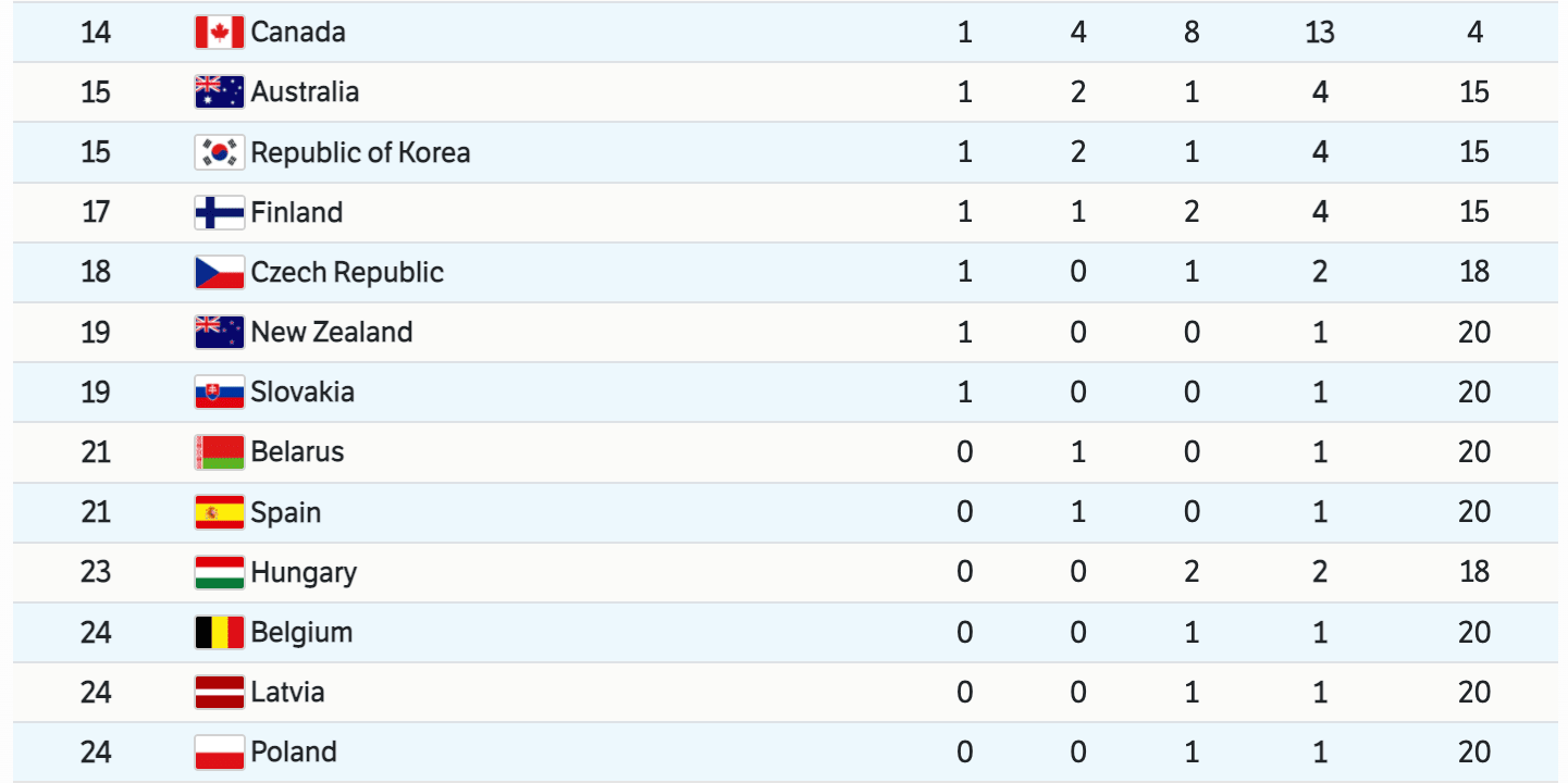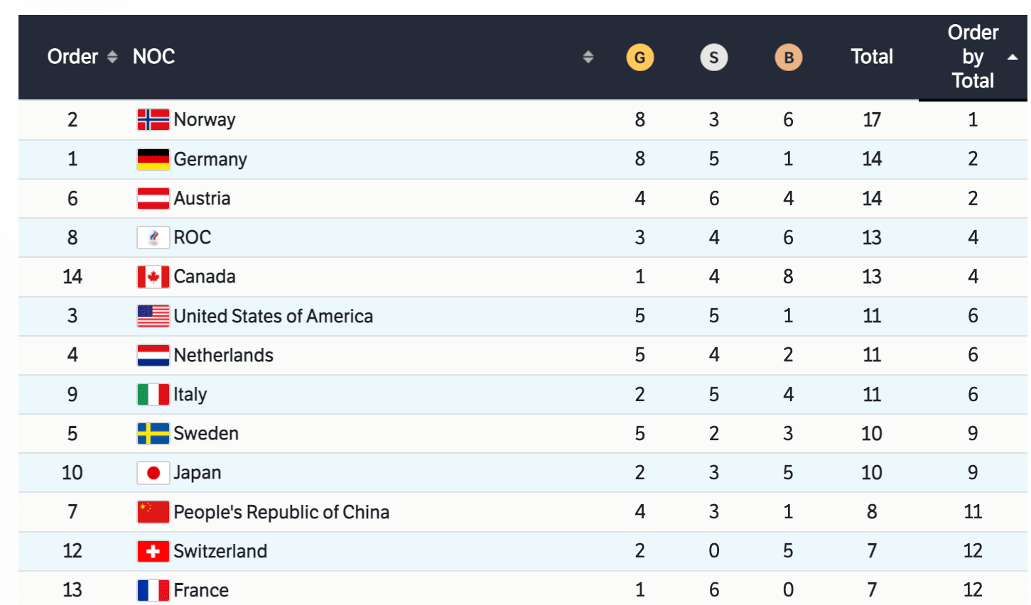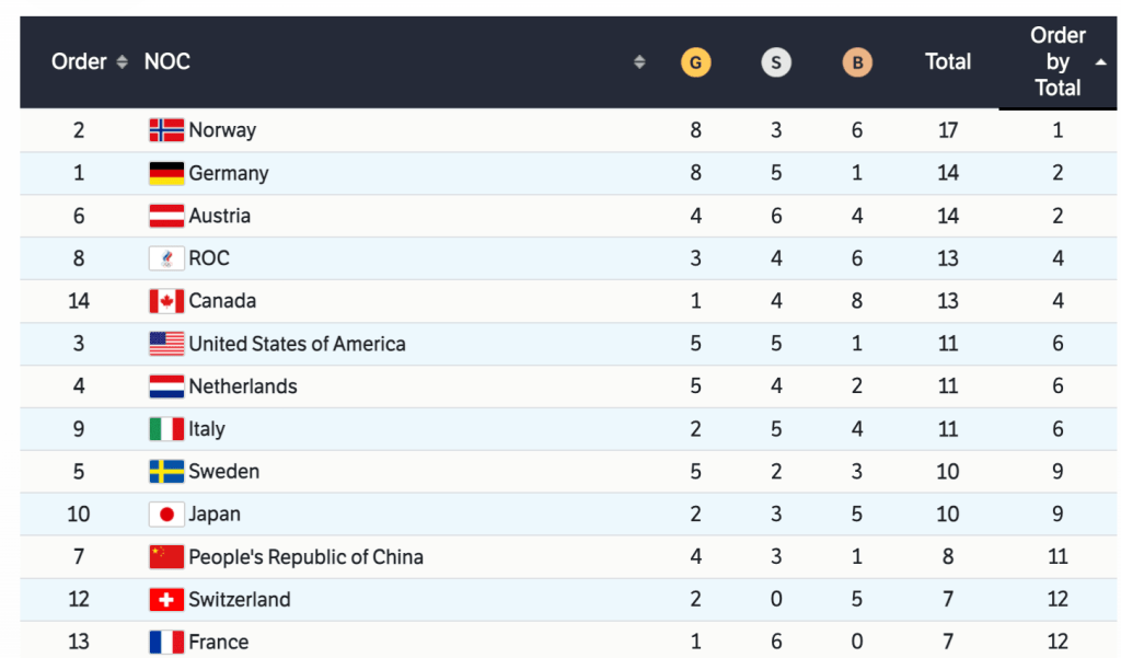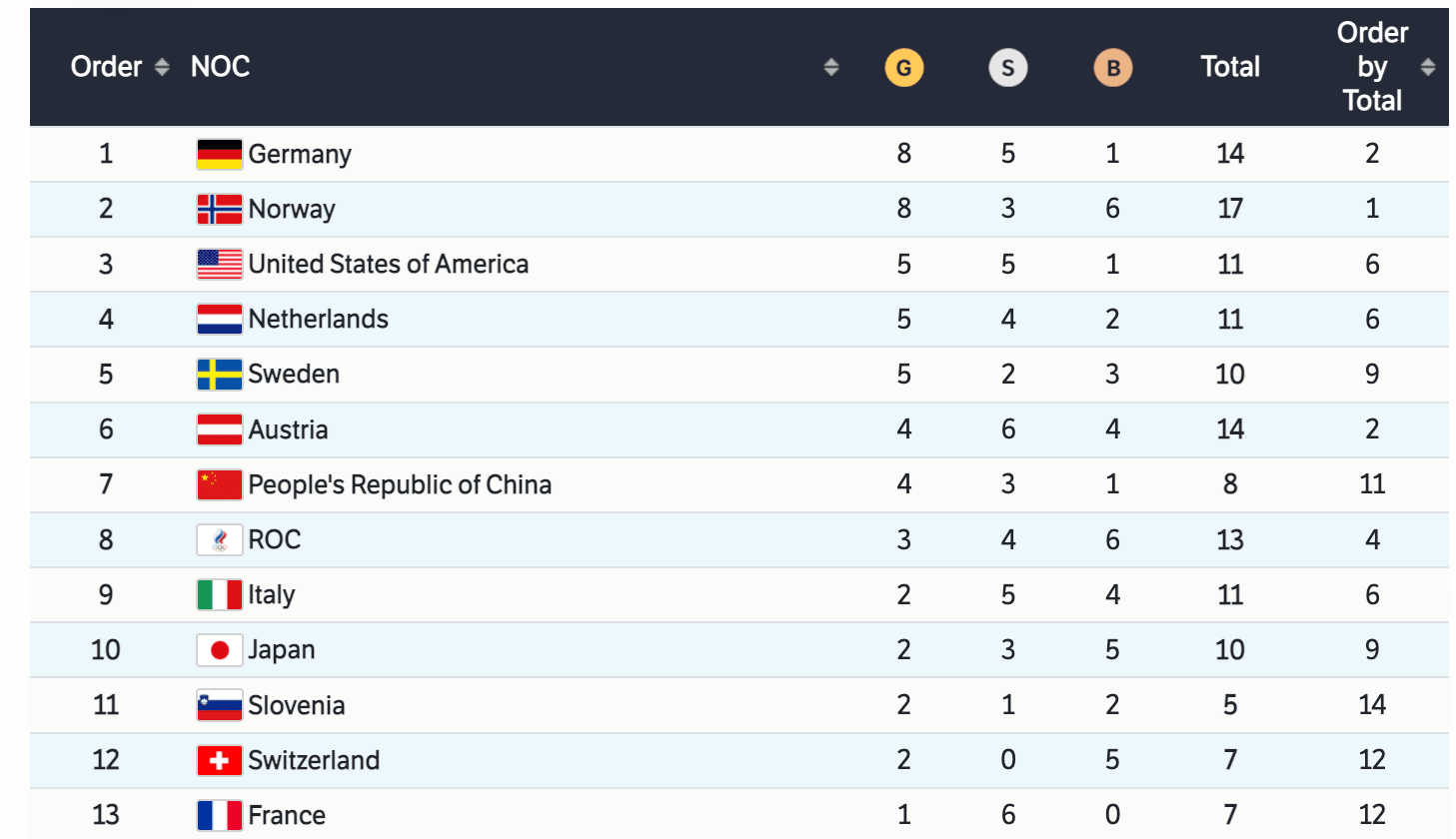 Germany is still in the lead with 8 gold medals. Norway is still in second with 8. the United States have moved up to third with 5 gold medals. Canada is still in 14th with 1 gold medal.