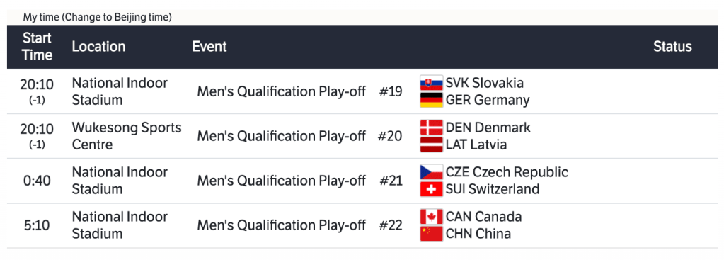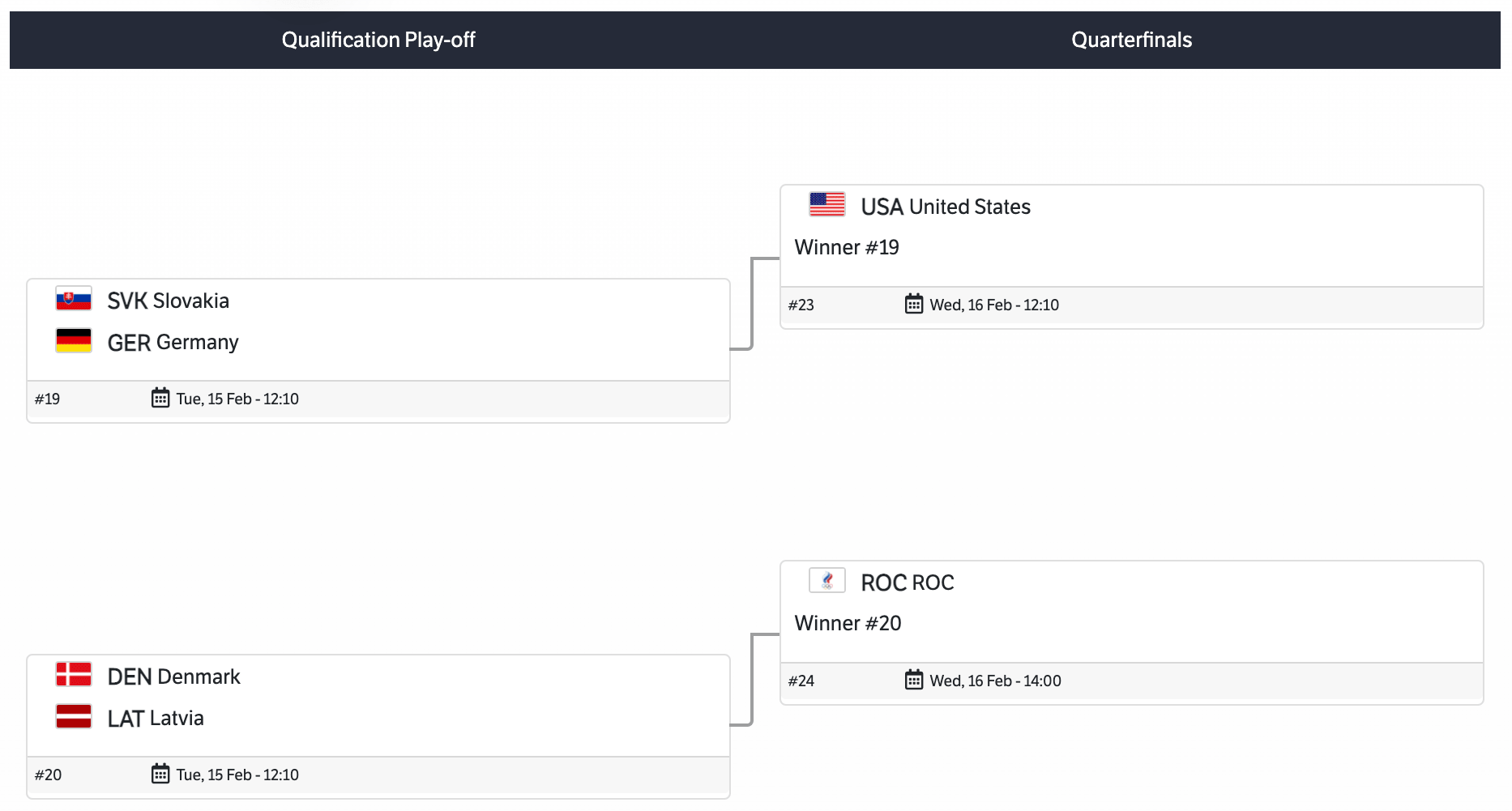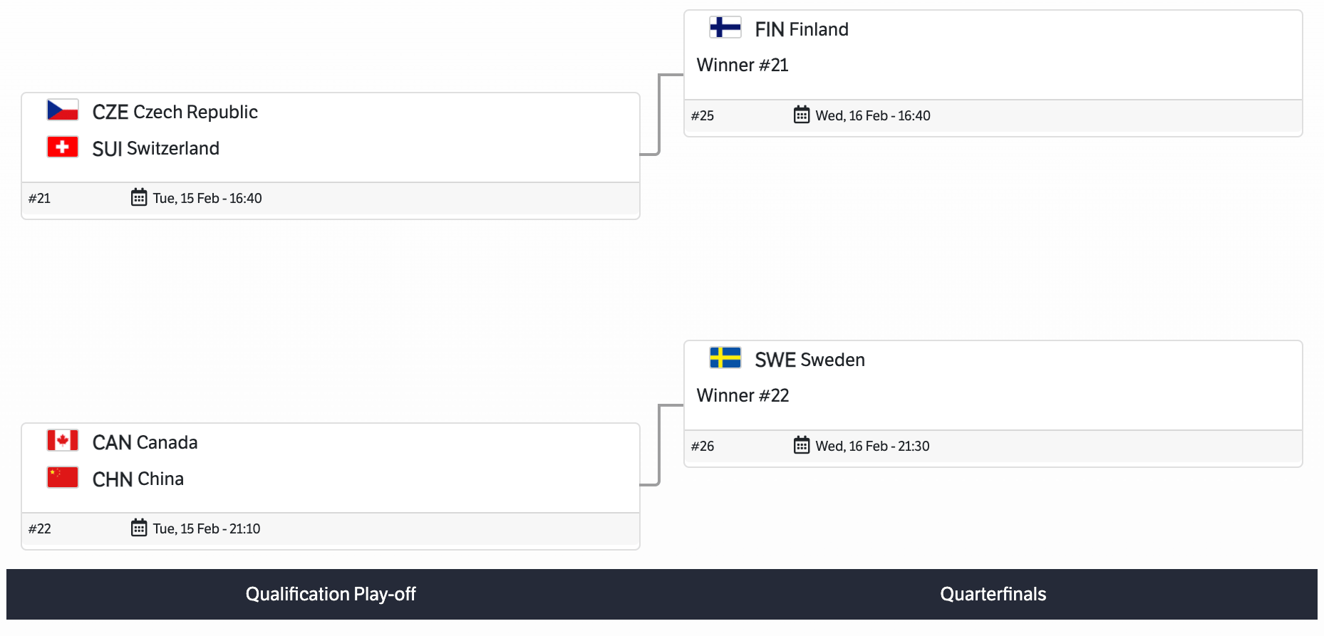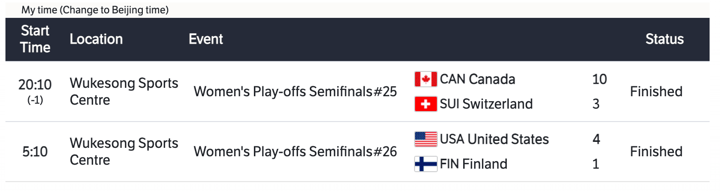 Ice Hockey. There was only two games. Both of them were women’s Semifinal games. The gold medal match is now set. The United States will take on Canada. No surprise there. Finland will take on Switzerland in the bronze medal game. These are all teams that were in Group A. The Men’s elimination round starts tonight.