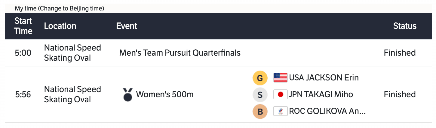 Speed Skating. Women’s 500m. The United States Erin Jackson won gold. Japans Miho Takagi won silver. ROC (Russia) Angelina Golikova won bronze. Speed Skating continues on the 14th.