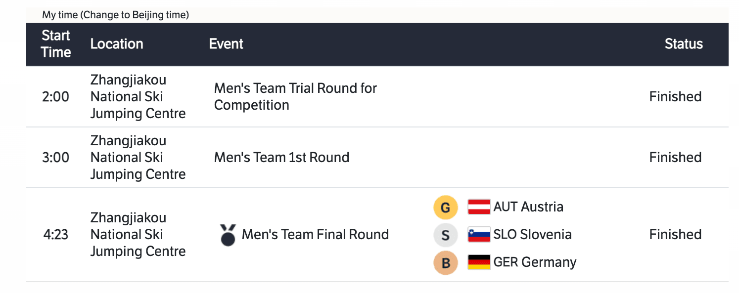 Ski Jumping. Men’s Team. Austria won gold. Slovenia won silver. Germany won Bronze. This concludes Ski Jumping at the 2022 Olympics.