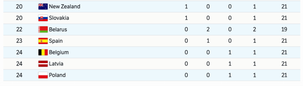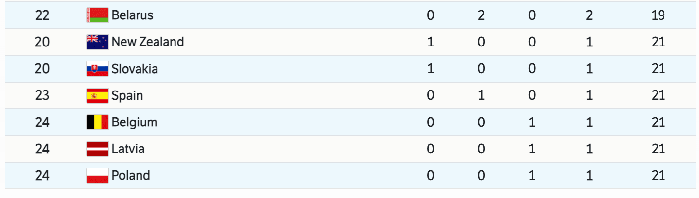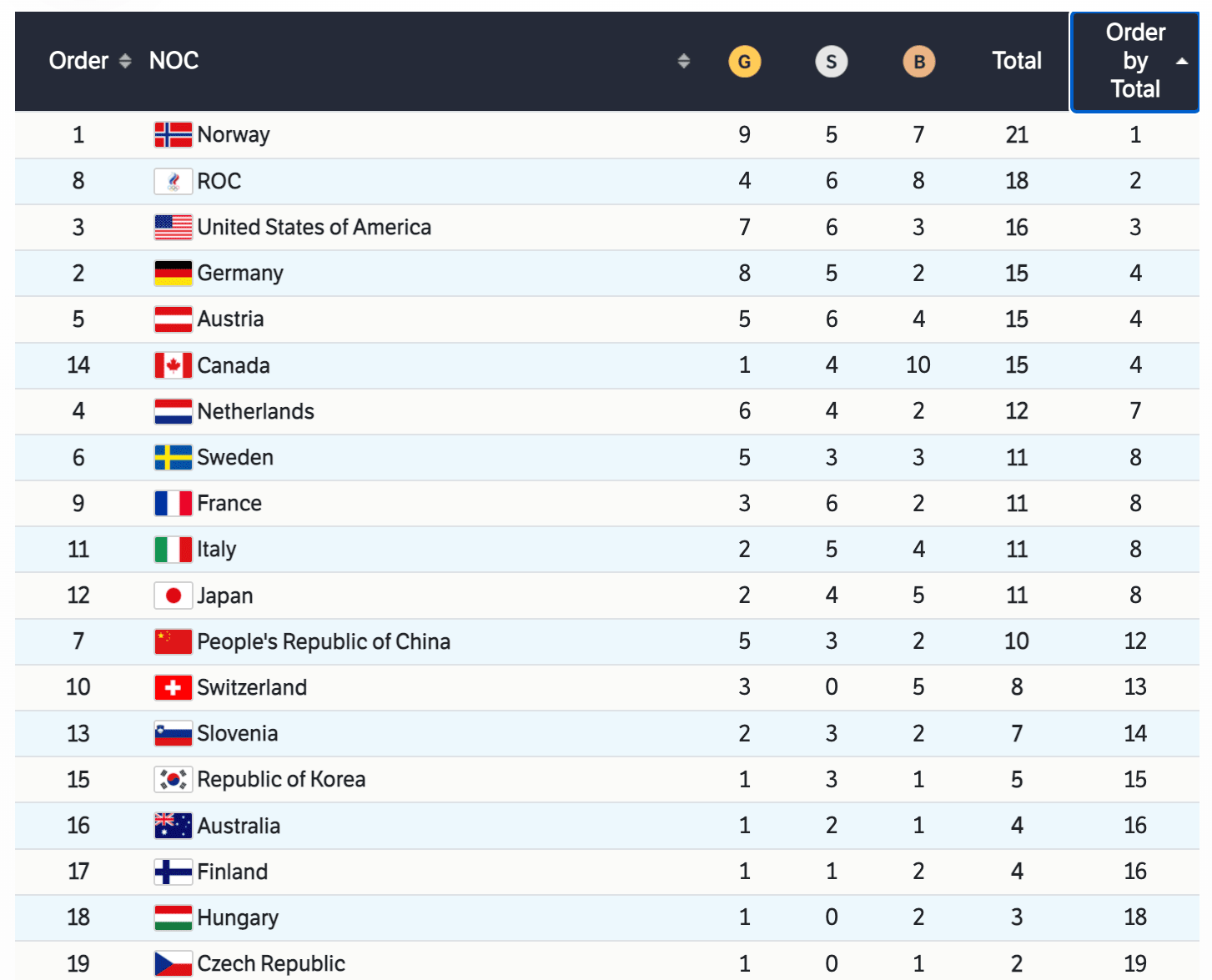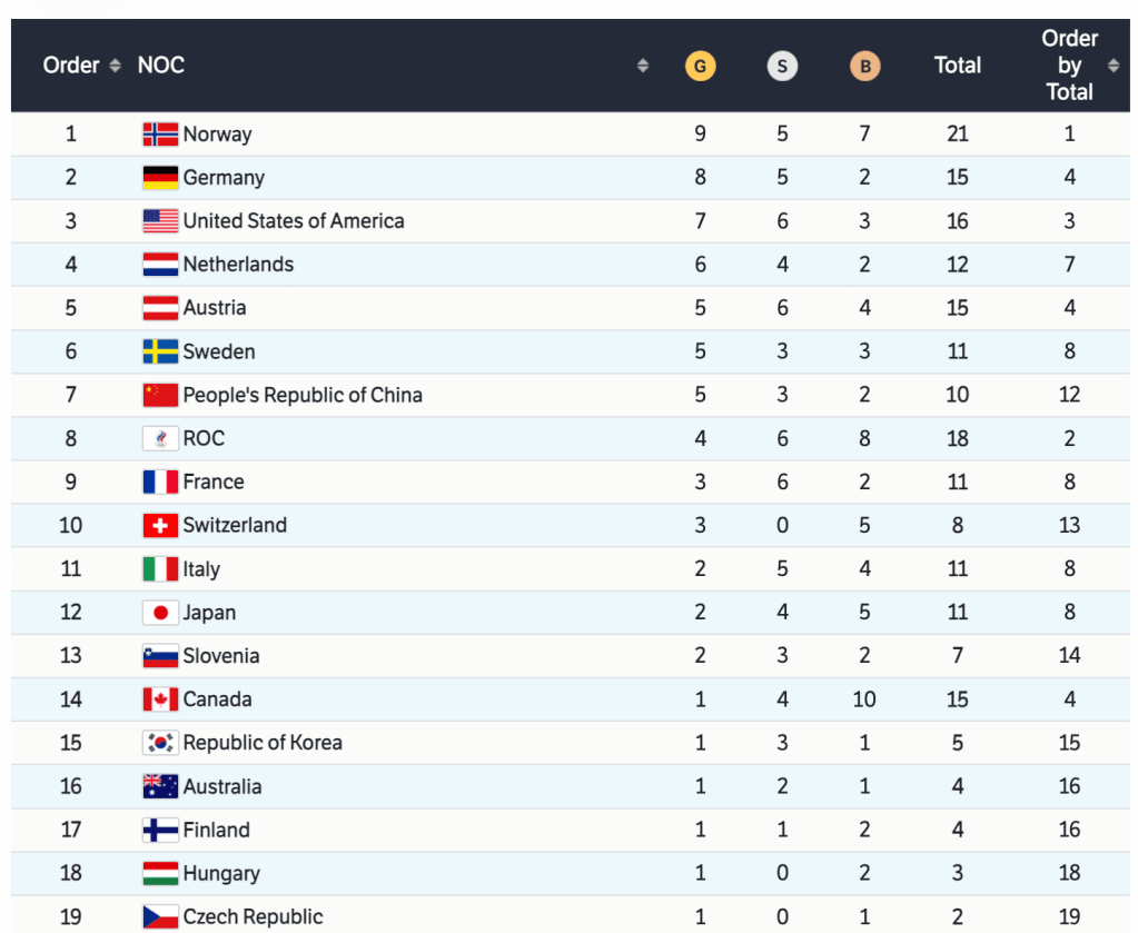 Norway still leads the overall with 21 medals. ROC (Russia) is in second with 18. The United States is in third with 16. Canada is now tied for fourth with 15 medals.