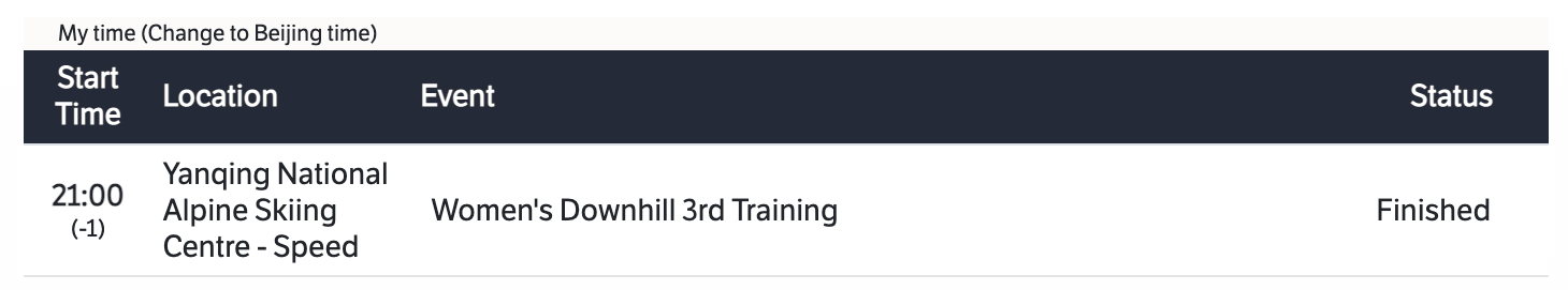 Alpine Skiing. Alpine Skiing had the Women’s Downhill 3rd Training. Alpine Skiing will continue tonight.
