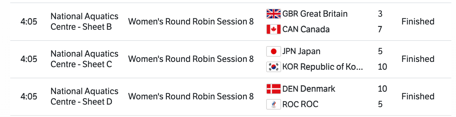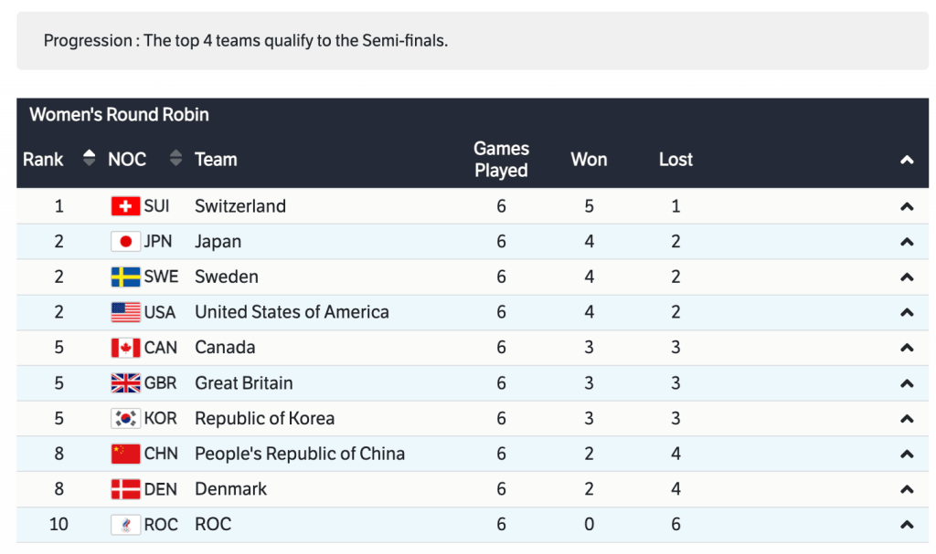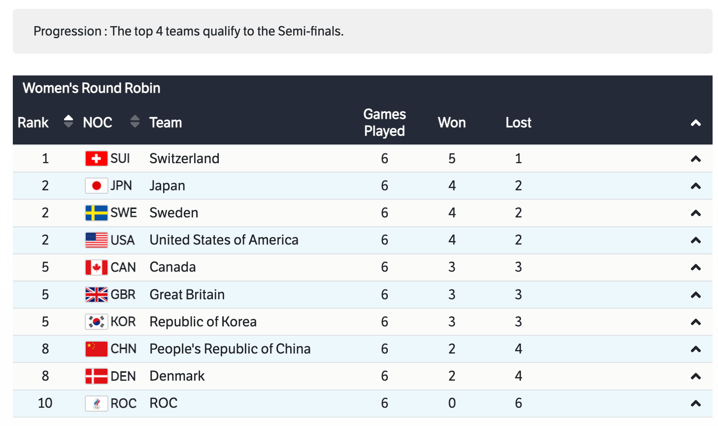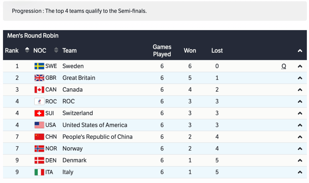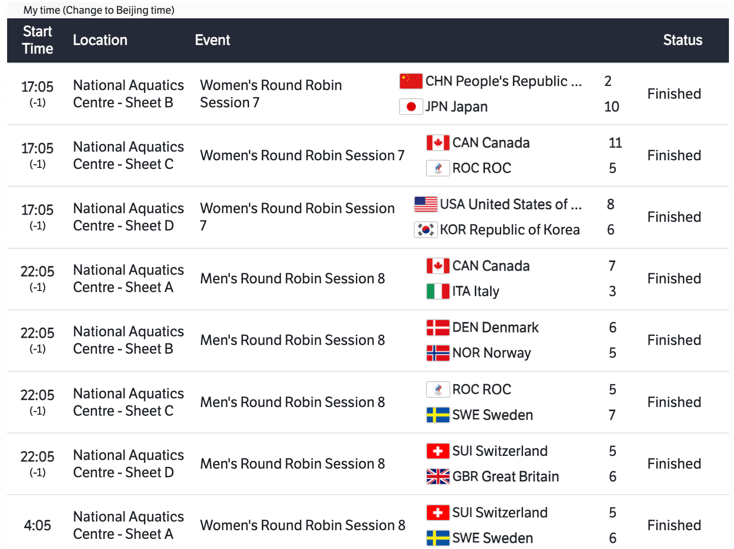 In Curling there was more round robin matches for both the Men’s and Women’s competitions. Eleven matches were played. In the Men’s competition Sweden leads the standings. They have qualified for the Semifinals. Great Britain is in second. Canada is in third. The United States is tied for fourth. In the Women’s competition Switzerland leads. The United States are tied for second. Canada is in fifth.