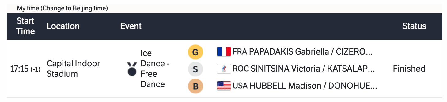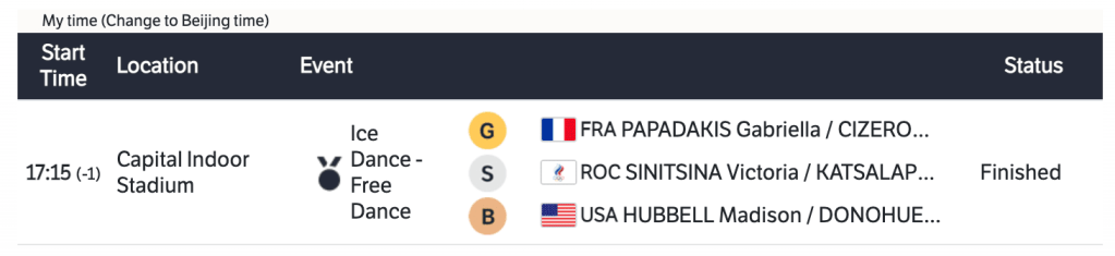 Figure Skating. Ice Dance – Free Dance. Frances Gabriella Papdakis and Guillaume Cizeron won gold. ROC (Russia) Victoria Sinitsina and Nikita Katsalapov won silver. The United States Madison Hubbell and Zachary Donohue won bronze. Figure Skating will continue in the AM.