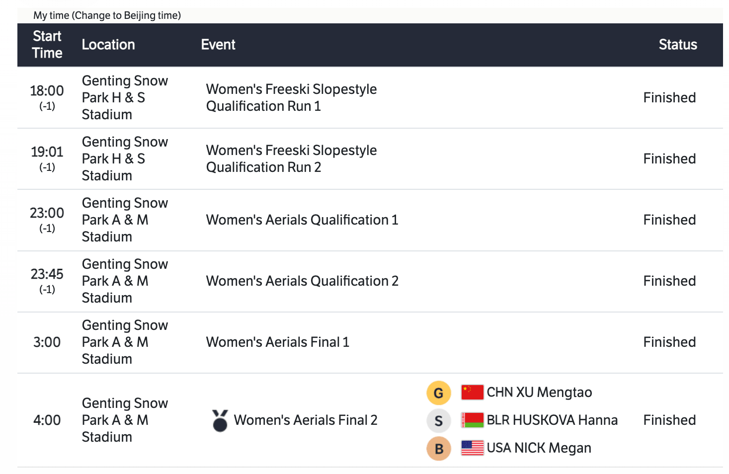 Freestyle Skiing. Women’s Freeski Slopestyle Qualification runs 1 and 2 happened. Women’s Aerials happened. Chinas Mengtaio Xu won gold. Belaruses Hanna Huskova won silver. The United States Megan Nick won bronze. Some of the competitions set to take place tonight have been rescheduled. I believe there still will be Freestyle Skiing tonight.