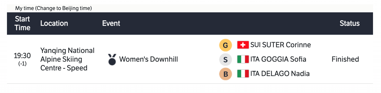 Coming up is Alpine Skiing, Biathlon, Bobsleigh, Cross-Country Skiing, Curling, Freestyle Skiing, Ice Hockey, Nordic Combined, and Short Track Speed Skating.