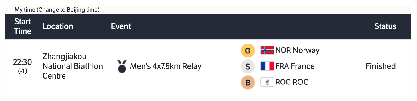 Biathlon. In Biathlon there was the Men’s 4×7.4km Relay. Norway won gold. France won silver. ROC (Russia) won bronze. The United States came in 13th. Biathlon continues tonight.