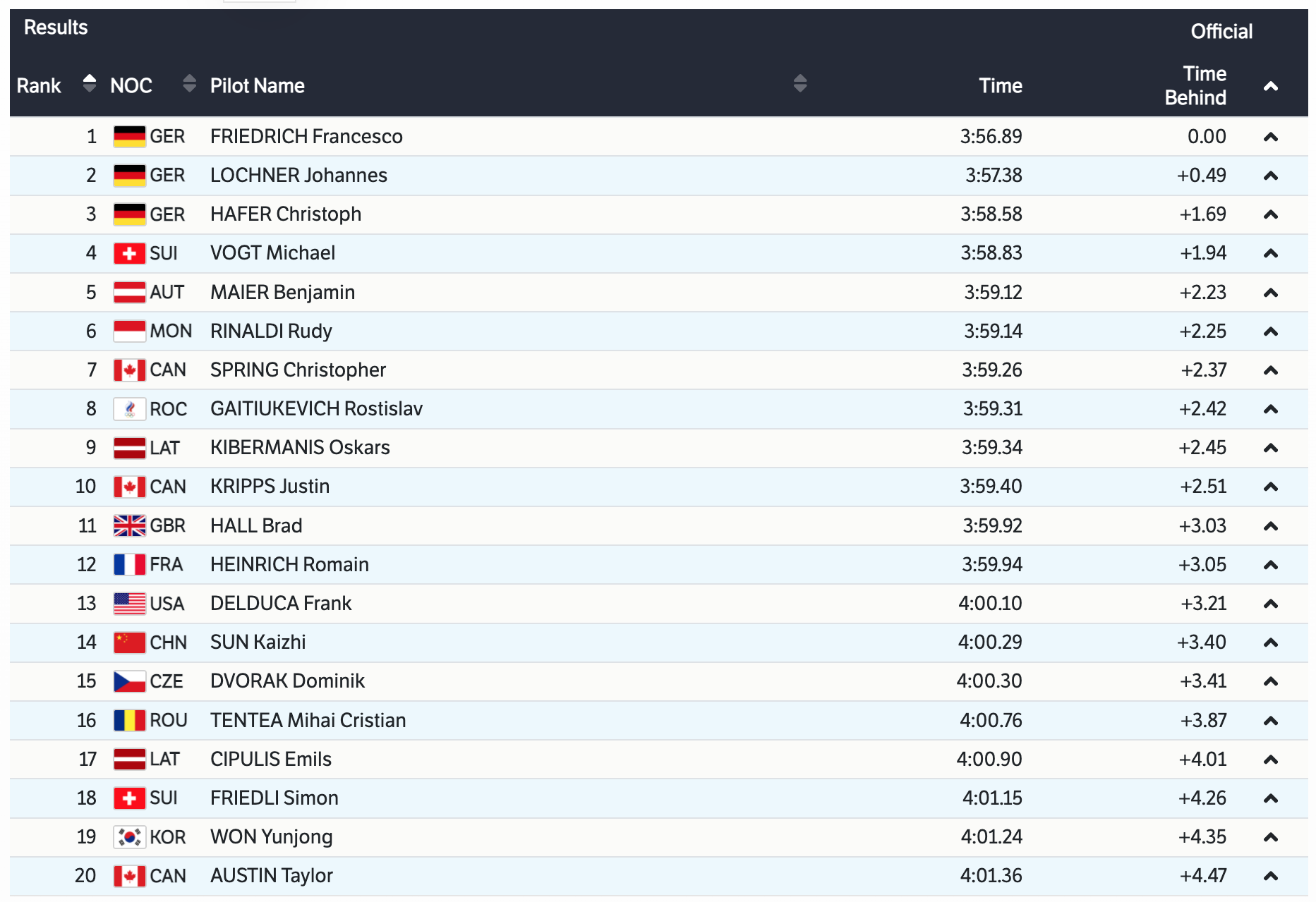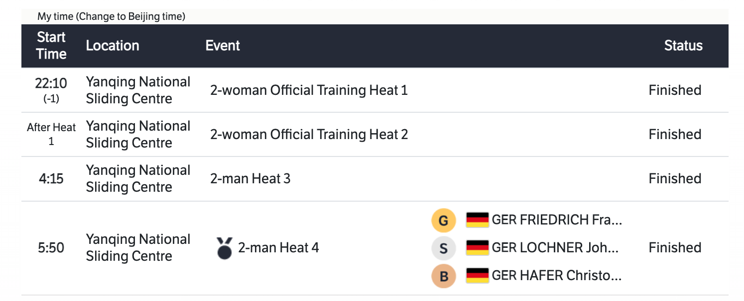 Bobsleigh. In Bobsleigh they had the 2-Woman Official Trining Heat 1 and 2. They also had the 2-Man Heat 3 and 4. For the 2-Man Germany swept the podium. Francesco Friedrich won gold. Johannes Lochner won silver. Christoph Hafer won bronze. The United States came in 13th. Bobsleigh continues tonight.