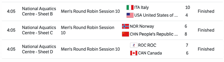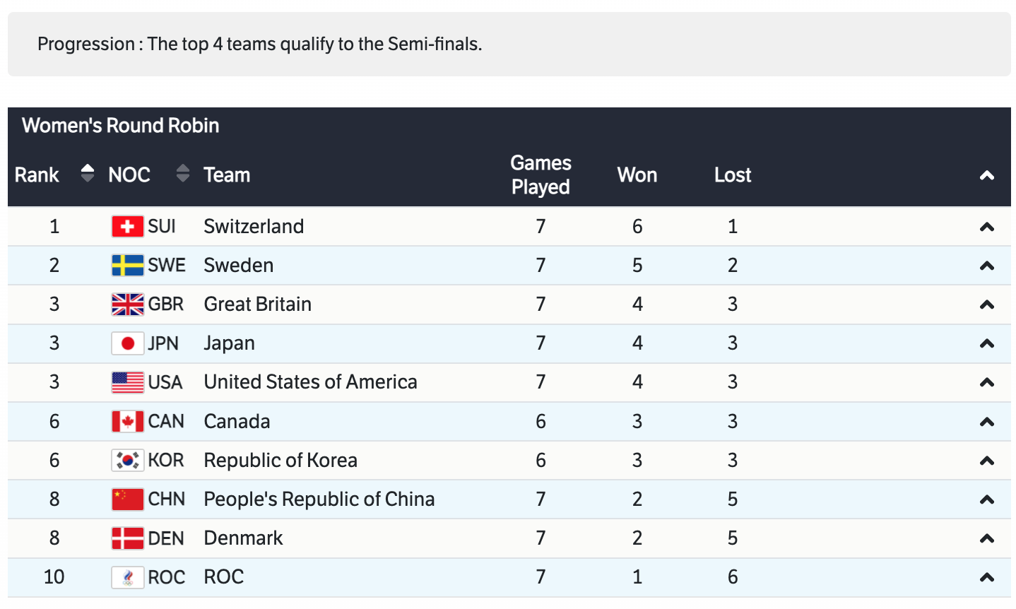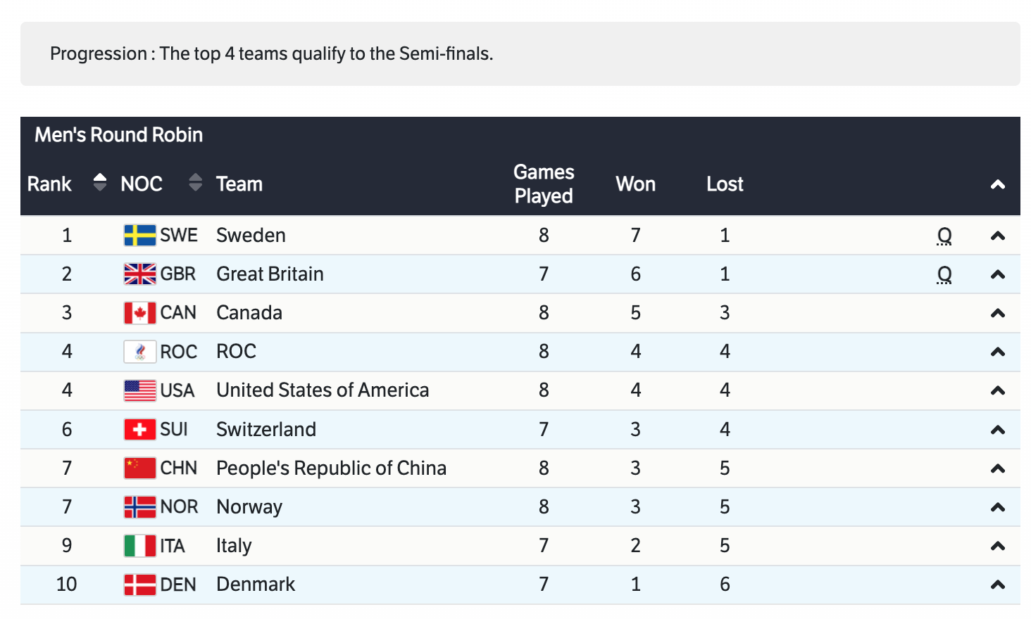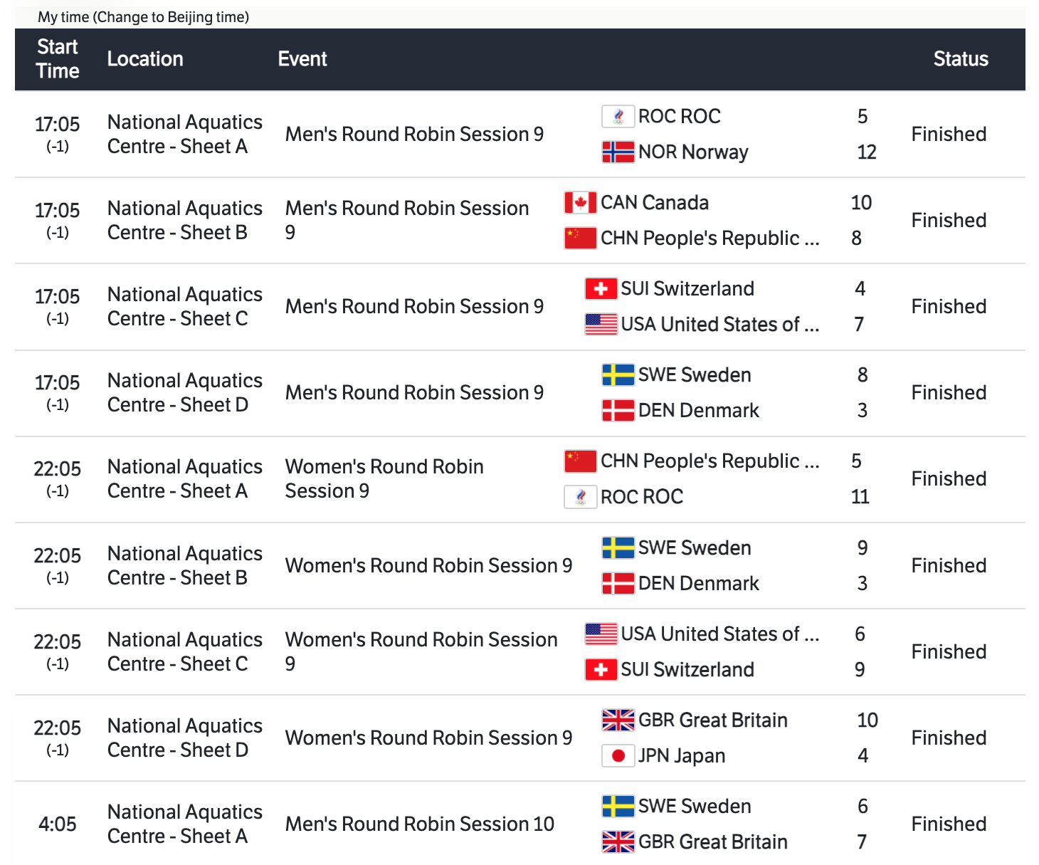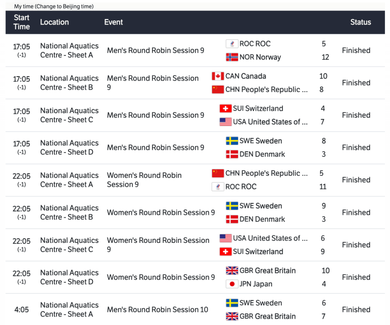 In Curling there was more round robin matches for both the Men’s and Women’s competitions. Twelve matches were played. In the Men’s competition Sweden leads the standings. Great Britain is in second. Both Sweden and Great Britain have qualified for the elimination stage. Canada is in third. The United States is tied with ROC (Russia) for the fourth and final spot. In the Women’s competition Switzerland is in first place. Sweden is in second place. Great Britain, Japan and the United States are tied for third. Canada is in sixth.