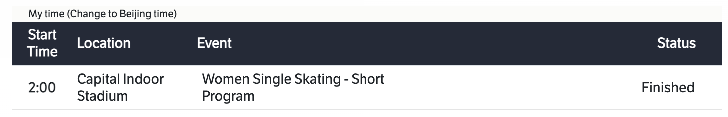 Figure Skating. Women’s Single Skating Short Program. Figure Skating continues on the 17th.