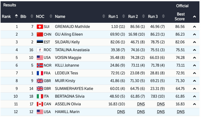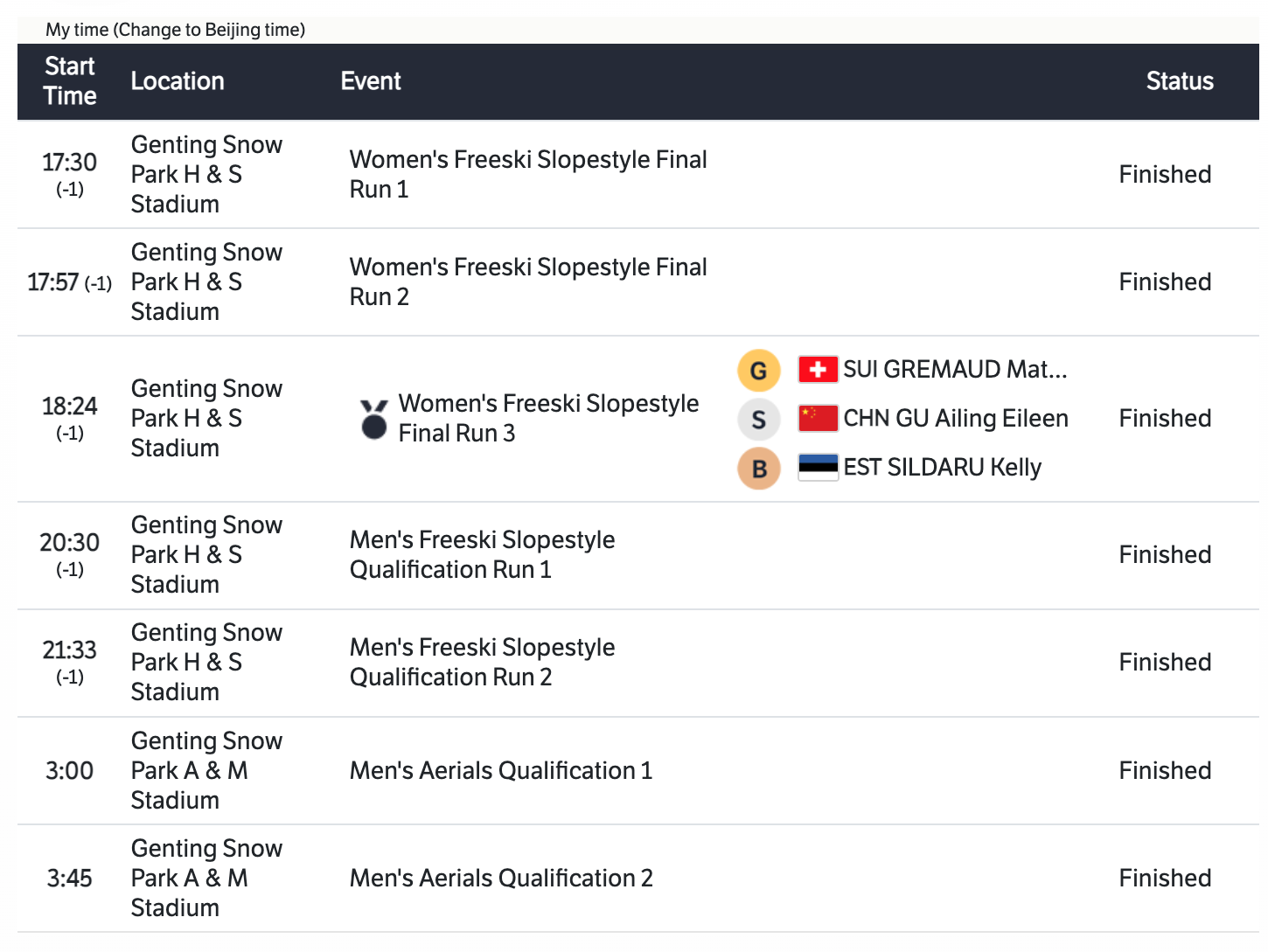 Freestyle Skiing. In Freestyle Skiing there was Women’s Slopestyle Finals. There was Men’s Slopestyle Qualification Runs. There was also Men’s Aerials Qualifications 1 and 2. In the Women’s Slopestyle Finals Switzerlands Mathilde Gremaud won gold. Chinas Ailing Eileen GU won silver. Estonias Kelly Sildaru won bronze. The United States finished in 5th and 12th. Freestyle Skiing continues tonight.