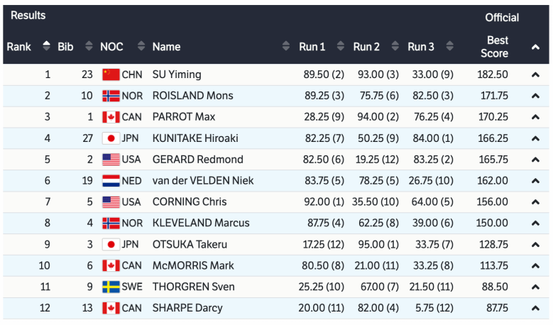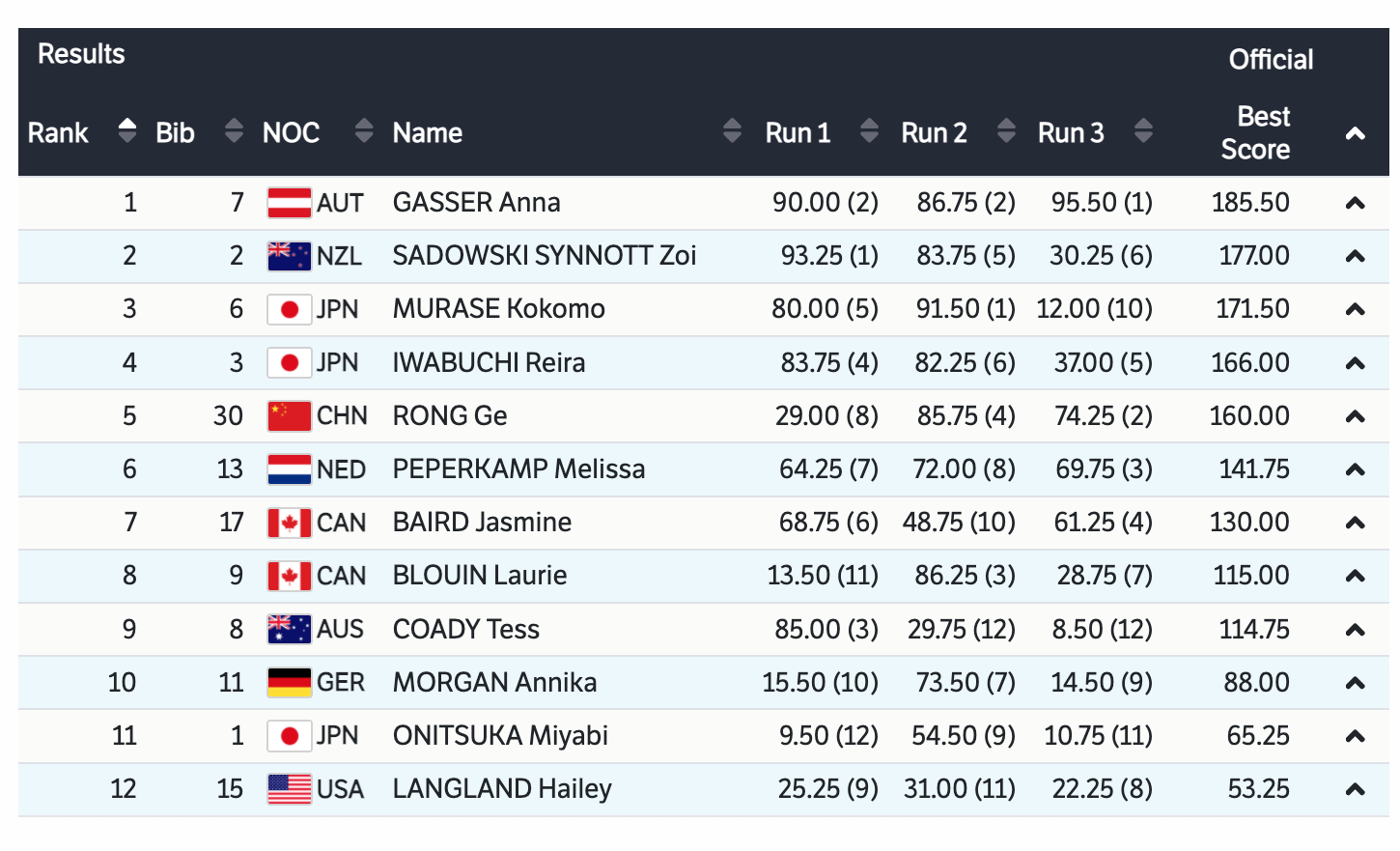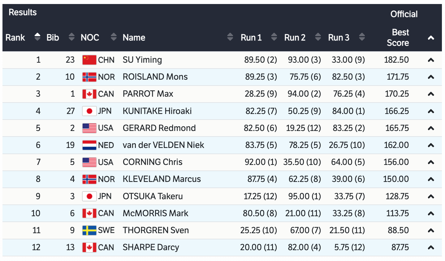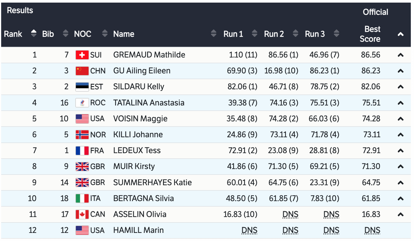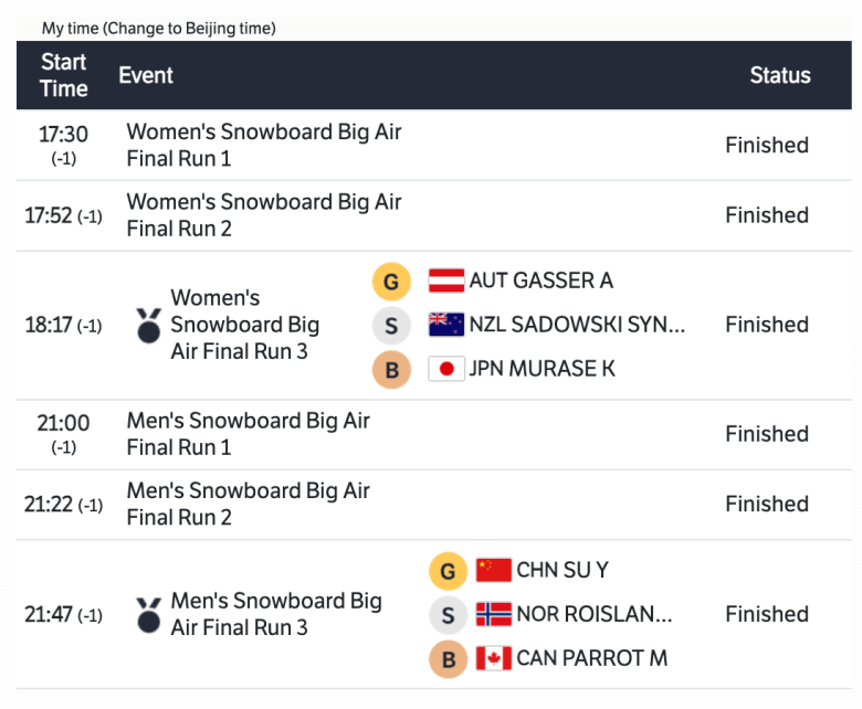 Snowboarding. They had the Men’s and Women’s big air finals. In the Men’s competition Chinas Yiming Su won gold. Norways Mons Roisland won silver. Canadas Max Parrot won bronze. The United States came in 5th and 7th. In the Women’s competition Austrias Anna Gasser won gold. New Zealands Zoi Sadowski Synnott won silver. Japans Kokomo Murase won bronze. With that Snowboarding at the 2022 Olympics has finished.