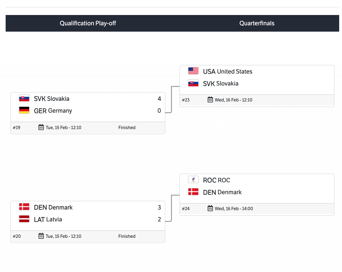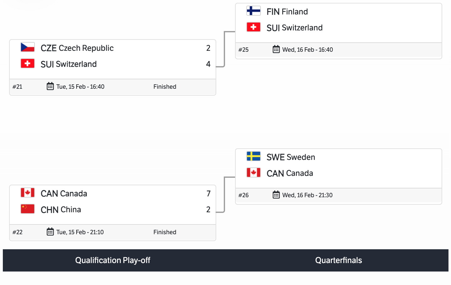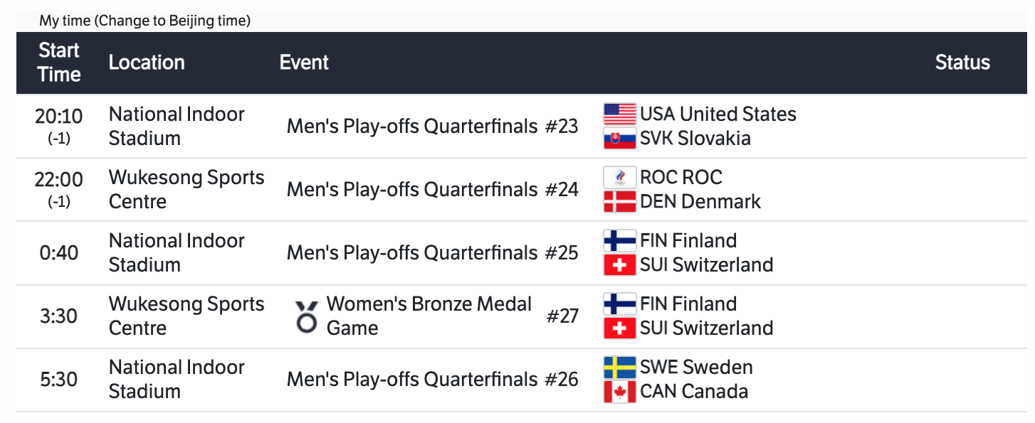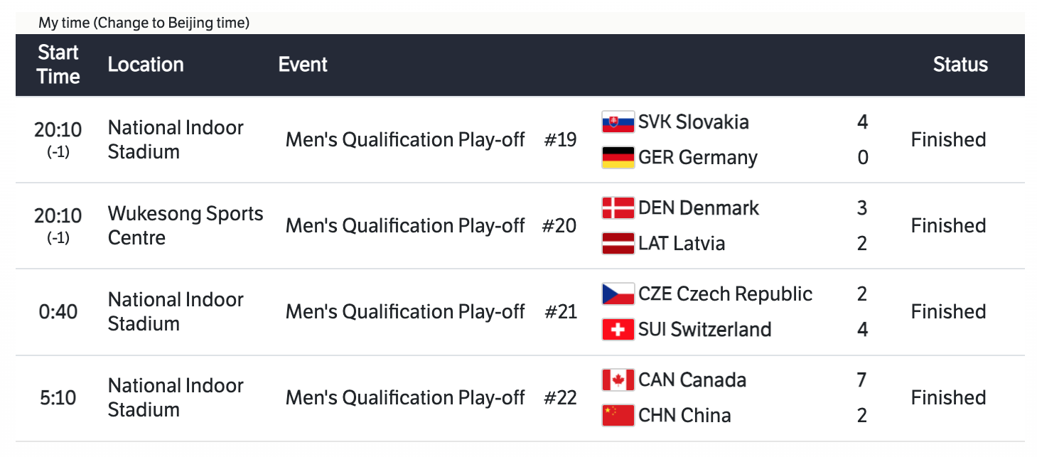 Ice Hockey. There were 4 games. All of them were Men’s Qualification Play-off games. The Quarterfinals are now set. I will go in depth on what happened in my next post. Five games are coming up including the Women’s bronze medal game.