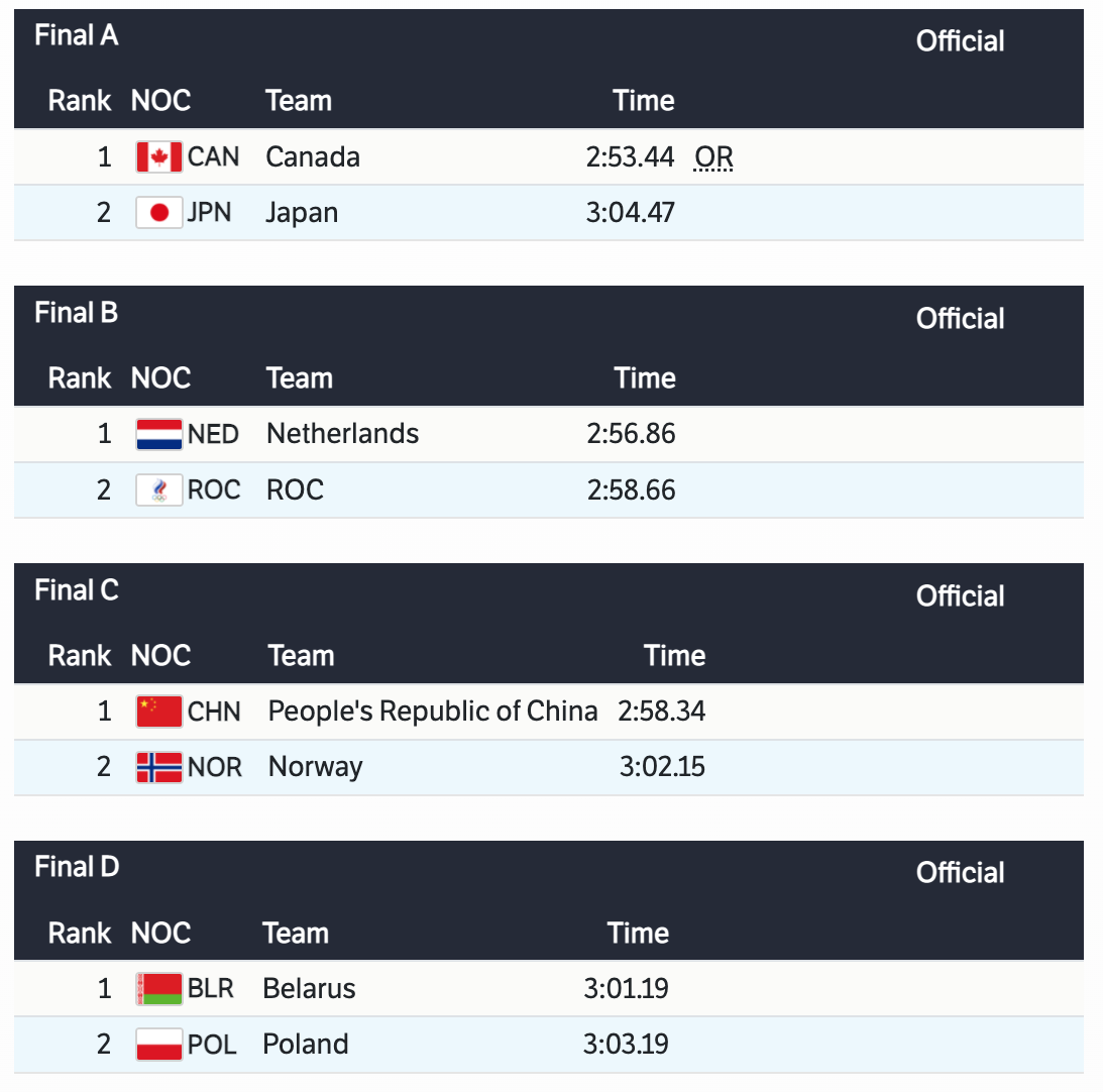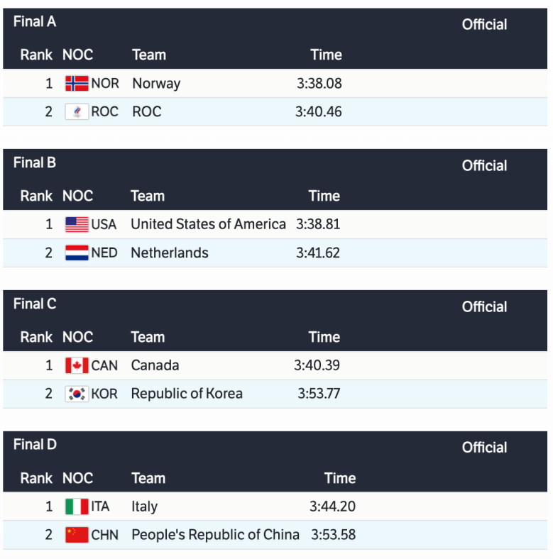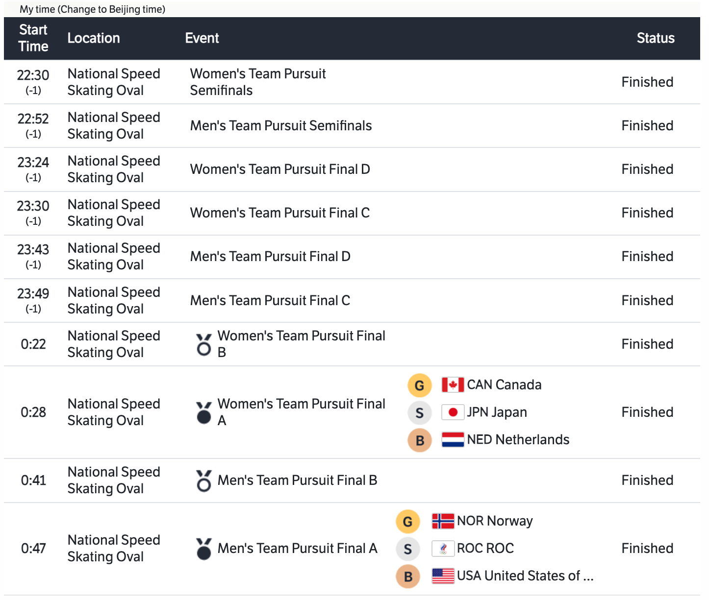 Speed Skating. Speed Skating had the Men’s and Women’s team pursuits. In the Women’s competition Canada won gold. Japan won silver. Netherlands won bronze. In the Men’s competition Norway won gold. ROC (Russia) won silver. The United States won bronze. Speed Skating continues on the 17th.