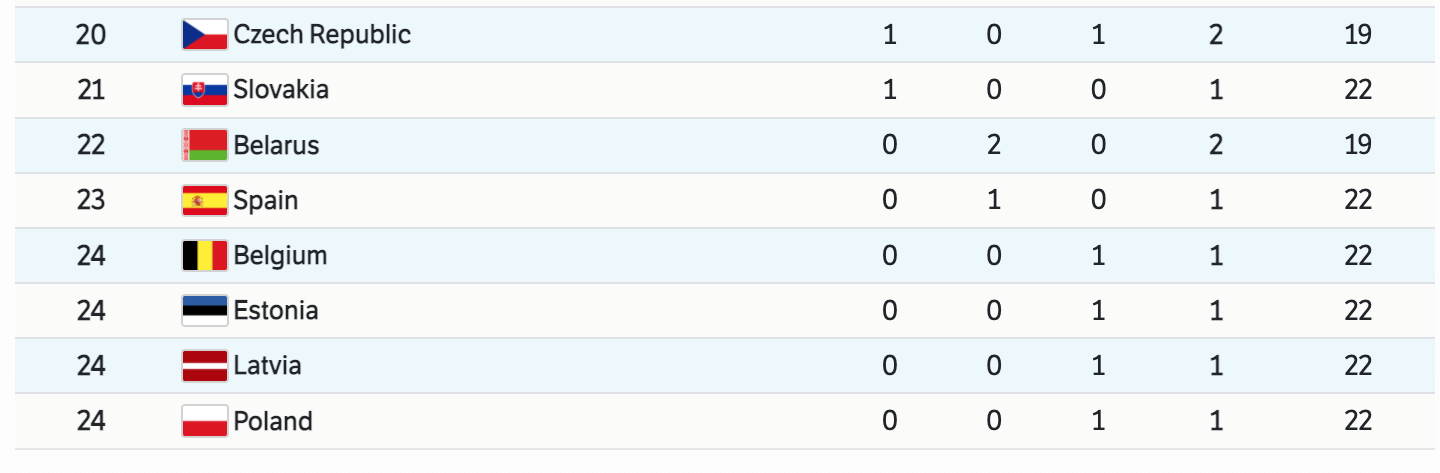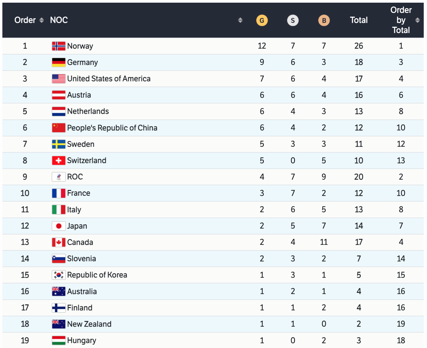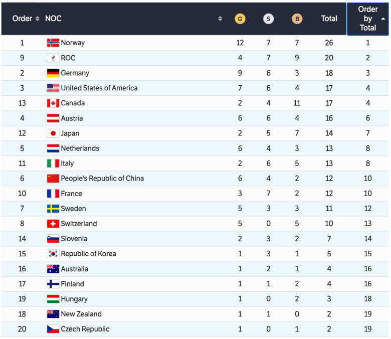 Norway still leads the overall with 26 medals. ROC (Russia) is in second with 20 medals. Germany is in third with 18 medals. The United States and Canada are now tied for fourth with 17 medals.