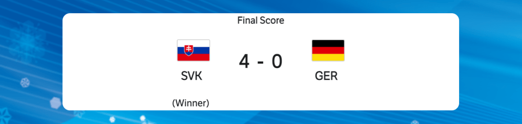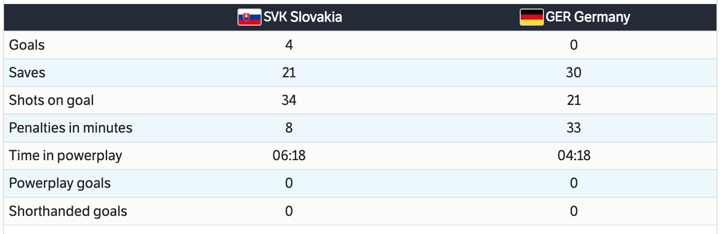 Slovakia vs Germany. Slovakia came in third in Group C. They went 1-2-0 in the group stage. Germany came in third in Group B. They went 1-2-0 in the group stage. Slovakia lead the game 1-0 after the first period. They managed to make it 3-0 in the second period. The final score was 4-0 Slovakia.