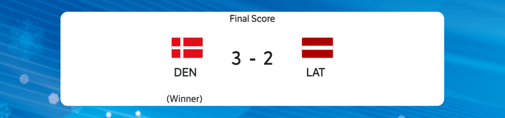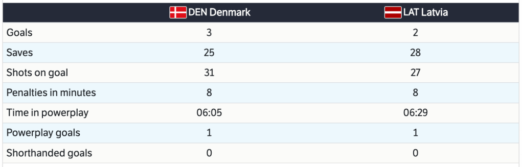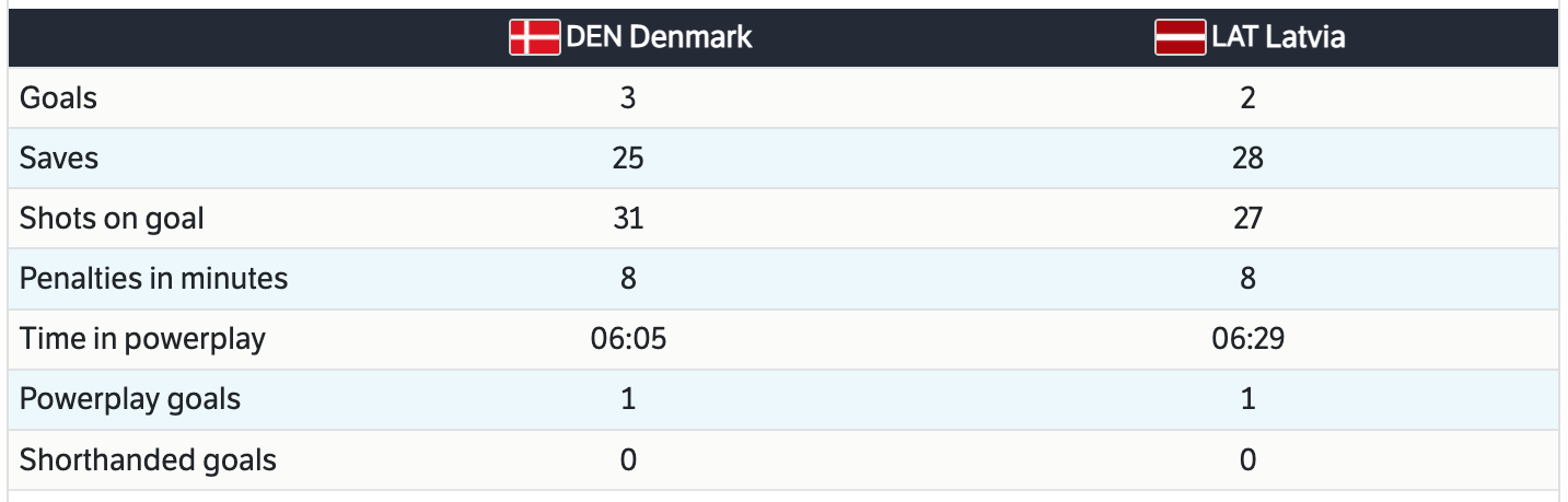 It was a really close game. Neither team seemed to have an edge until Denmark scored in the third period. Denmark has eliminated Latvia. Both teams had a few penalties but not a lot. Both teams were able to score on the powerplay. Special teams only really gave Denmark the advantage. Denmark will be moving on to the Quarterfinals.