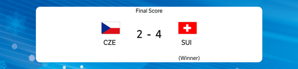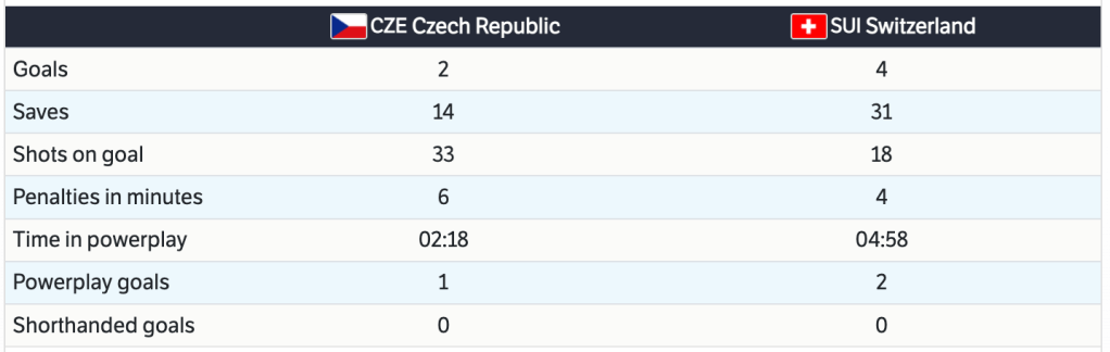 Czech Republic vs Switzerland. The Czech Republic Were third in Group B. They finished the group stage with a record of 2-1-0. Switzerland finished last in Group B. They had a record of 0-2-1 in the group stage. The Czech Republic beat Switzerland during the group stage. The score of that game was 2-1 Czech Republic. Czech Republic scored first. The score was 2-1 Switzerland after the first period. Switzerland would score the only goal of the second period. Switzerland would take a 4-1 lead in the third period. Czech Republic would get one back in the last 5 minutes of the game after pulling their goalie. Switzerland was able to hold the lead. The final score was 2-4 Switzerland.